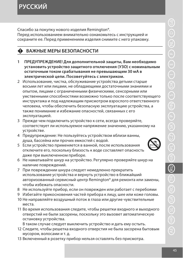 ПРЕДУПРЕЖДЕНИЕ! Для дополнительной защиты, Вам необходимо установить устройство защитного отключения (УЗО) с номинальным остаточным током срабатывания не превышающим 30 мА в электрической цепи. Посоветуйтесь с электриком. 2 Использование, чистка, обслуживание устройства детьми старше восьми лет или лицами, не обладающими достаточными знаниями и опытом, лицами с ограниченными физическими, сенсорными или умственными способностями возможно только после соответствующего инструктажа и под надлежащим присмотром взрослого ответственного человека, чтобы обеспечить безопасную эксплуатацию устройства, а также понимание и избежание опасностей, связанных с его эксплуатацией. 3 Прежде чем подключить устройство к сети, всегда проверяйте, соответствует ли используемое напряжение значению, указанному на устройстве. 4 Предупреждение: Не пользуйтесь устройством вблизи ванны, душа, бассейна или прочих емкостей с водой. 5 Если устройство применяется в ванной, после использования отключите его, поскольку близость к воде составляет опасность даже при выключенном приборе. 6 Не наматывайте шнур на устройство. Регулярно проверяйте шнур на наличие повреждений. 7 При повреждении шнура следует немедленно прекратить использование устройства и вернуть устройство в ближайший авторизованный сервисный центр Remington® для ремонта или замены, чтобы избежать опасности. 8 Не используйте прибор, если он поврежден или работает с перебоями 9 Избегайте прикосновения частей прибора к лицу, шее или коже головы. 10 Не направляйте воздушный поток в глаза или другие чувствительные места. 11 Во время использования следите, чтобы решетки входного и выходного отверстий не были засорены, поскольку это вызовет автоматическую остановку устройства. В таком случае следует выключить устройство и дать ему остыть. 12 Следите, чтобы решетка входного отверстия не была засорена бытовым мусором, волосами и т. д. 13 Включенный в розетку прибор нельзя оставлять без присмотра.