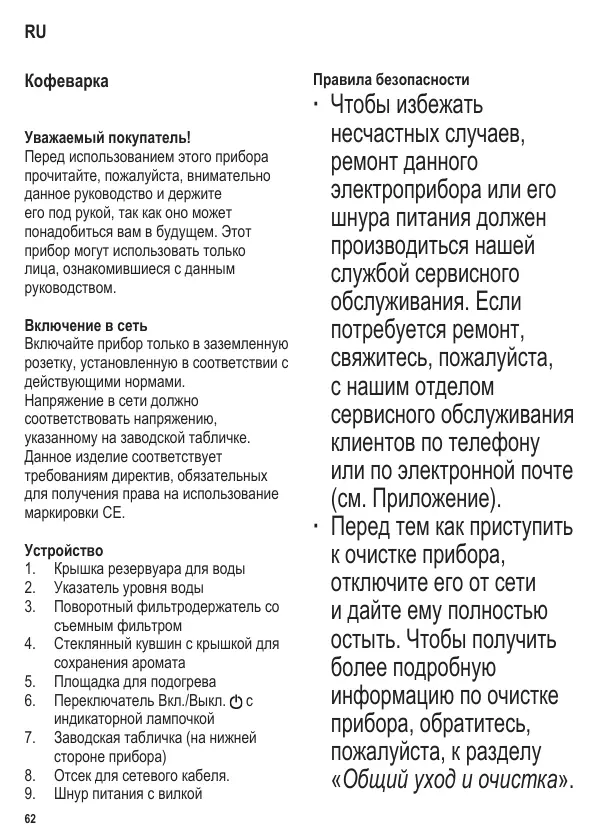 Cet appareil doit être branché sur une prise de courant avec terre installée selon les normes en vigueur. Assurez-vous que la tension d’alimentation correspond à la tension indiquée sur la plaque signalétique. Ce produit est conforme à toutes les directives relatives au marquage “CE”. Familiarisez-vous avec votre appareil 1. Couvercle du réservoir d’eau 2. Indicateur de niveau d’eau 3. Porte-filtre pivotant avec filtre plastique amovible 4. Verseuse en verre avec couvercle conservateur d’arôme 5. Plaque chauffante 6. Interrupteur avec témoin lumineux 7. Plaque signalétique (à la base) 8. Logement de cordon (dans le support) 9. Cordon d’alimentation avec fiche