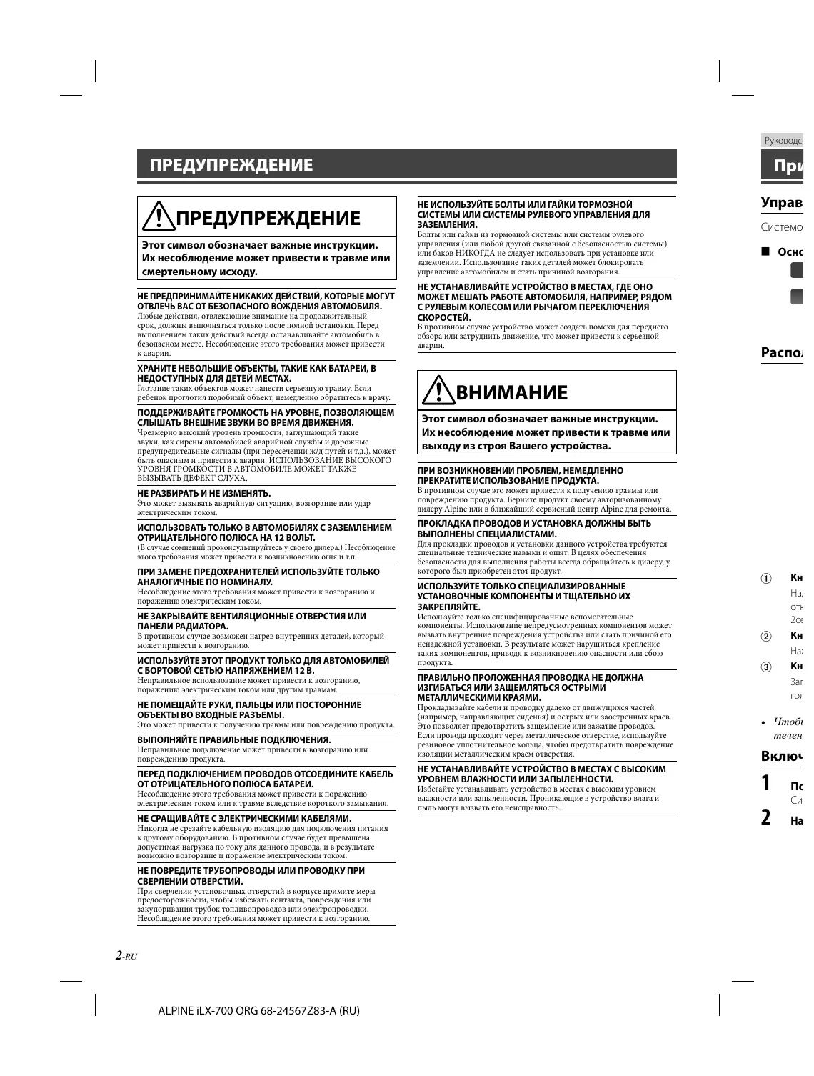 Этот символ обозначает важные инструкции. Их несоблюдение может привести к травме или выходу из строя Вашего устройства. ПРИ ВОЗНИКНОВЕНИИ ПРОБЛЕМ, НЕМЕДЛЕННО ПРЕКРАТИТЕ ИСПОЛЬЗОВАНИЕ ПРОДУКТА. Это может вызывать аварийную ситуацию, возгорание или удар электрическим током. В противном случае это может привести к получению травмы или повреждению продукта. Верните продукт своему авторизованному дилеру Alpine или в ближайший сервисный центр Alpine для ремонта. ИСПОЛЬЗОВАТЬ ТОЛЬКО В АВТОМОБИЛЯХ С ЗАЗЕМЛЕНИЕМ ОТРИЦАТЕЛЬНОГО ПОЛЮСА НА 12 ВОЛЬТ. ПРОКЛАДКА ПРОВОДОВ И УСТАНОВКА ДОЛЖНЫ БЫТЬ ВЫПОЛНЕНЫ СПЕЦИАЛИСТАМИ. НЕ РАЗБИРАТЬ И НЕ ИЗМЕНЯТЬ. (В случае сомнений проконсультируйтесь у своего дилера.) Несоблюдение этого требования может привести к возникновению огня и т.п. ПРИ ЗАМЕНЕ ПРЕДОХРАНИТЕЛЕЙ ИСПОЛЬЗУЙТЕ ТОЛЬКО АНАЛОГИЧНЫЕ ПО НОМИНАЛУ. Несоблюдение этого требования может привести к возгоранию и поражению электрическим током. НЕ ЗАКРЫВАЙТЕ ВЕНТИЛЯЦИОННЫЕ ОТВЕРСТИЯ ИЛИ ПАНЕЛИ РАДИАТОРА. В противном случае возможен нагрев внутренних деталей, который может привести к возгоранию. ИСПОЛЬЗУЙТЕ ЭТОТ ПРОДУКТ ТОЛЬКО ДЛЯ АВТОМОБИЛЕЙ С БОРТОВОЙ СЕТЬЮ НАПРЯЖЕНИЕМ 12 В. Неправильное использование может привести к возгоранию, поражению электрическим током или другим травмам. НЕ ПОМЕЩАЙТЕ РУКИ, ПАЛЬЦЫ ИЛИ ПОСТОРОННИЕ ОБЪЕКТЫ ВО ВХОДНЫЕ РАЗЪЕМЫ. Это может привести к получению травмы или повреждению продукта. ВЫПОЛНЯЙТЕ ПРАВИЛЬНЫЕ ПОДКЛЮЧЕНИЯ. Неправильное подключение может привести к возгоранию или повреждению продукта. ПЕРЕД ПОДКЛЮЧЕНИЕМ ПРОВОДОВ ОТСОЕДИНИТЕ КАБЕЛЬ ОТ ОТРИЦАТЕЛЬНОГО ПОЛЮСА БАТАРЕИ. Несоблюдение этого требования может привести к поражению электрическим током или к травме вследствие короткого замыкания. НЕ СРАЩИВАЙТЕ С ЭЛЕКТРИЧЕСКИМИ КАБЕЛЯМИ. Никогда не срезайте кабельную изоляцию для подключения питания к другому оборудованию. В противном случае будет превышена допустимая нагрузка по току для данного провода, и в результате возможно возгорание и поражение электрическим током. НЕ ПОВРЕДИТЕ ТРУБОПРОВОДЫ ИЛИ ПРОВОДКУ ПРИ СВЕРЛЕНИИ ОТВЕРСТИЙ. При сверлении установочных отверстий в корпусе примите меры предосторожности, чтобы избежать контакта, повреждения или закупоривания трубок топливопроводов или электропроводки. Несоблюдение этого требования может привести к возгоранию. 2-RU ALPINE iLX-700 QRG 68-24567Z83-A (RU) Для прокладки проводов и установки данного устройства требуются специальные технические навыки и опыт. В целях обеспечения безопасности для выполнения работы всегда обращайтесь к дилеру, у которого был приобретен этот продукт. ИСПОЛЬЗУЙТЕ ТОЛЬКО СПЕЦИАЛИЗИРОВАННЫЕ УСТАНОВОЧНЫЕ КОМПОНЕНТЫ И ТЩАТЕЛЬНО ИХ ЗАКРЕПЛЯЙТЕ. Используйте только специфицированные вспомогательные компоненты. Использование непредусмотренных компонентов может вызвать внутренние повреждения устройства или стать причиной его ненадежной установки. В результате может нарушиться крепление таких компонентов, приводя к возникновению опасности или сбою