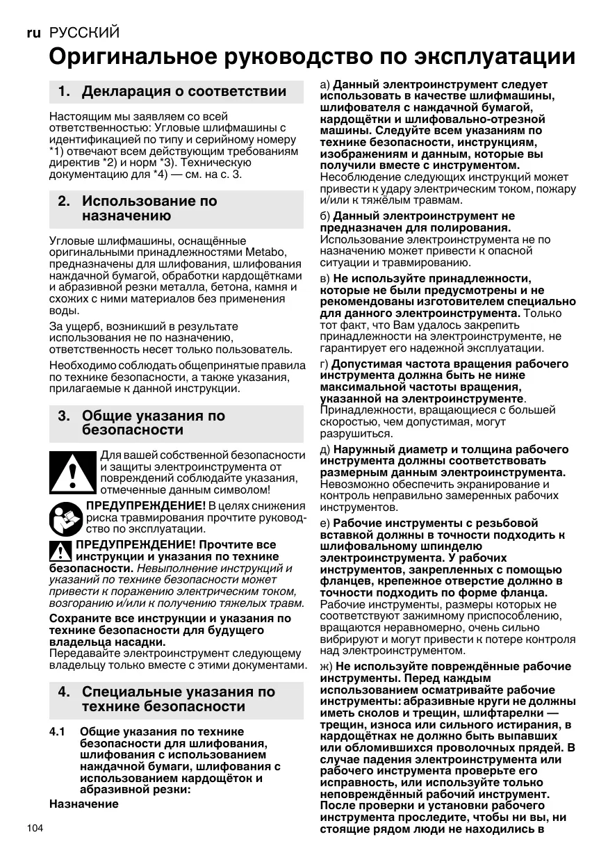 РУКОВОДСТВО ПОЛЬЗОВАТЕЛЯ W 1100-115 W 1100-125 W 1150-125 WP 1200-115 RT WP 1200-125 RT WE 1500-125 RT WE 1500-150 RT WEV 1500-125 RT WEV 1500-125 Quick RT METABO