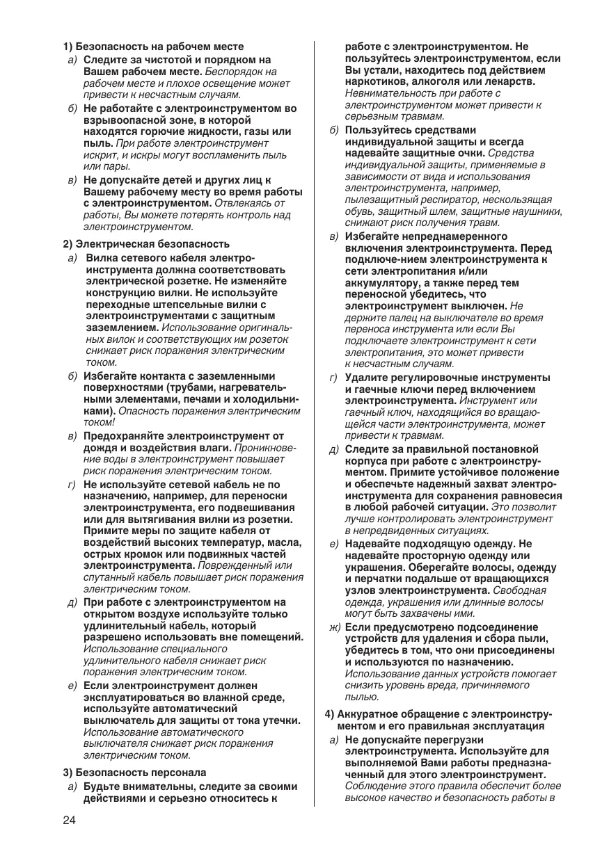 1) Sécurité de la zone de travail a) Conserver la zone de travail propre et bien éclairée. Les zones en désordre ou sombres sont propices aux accidents. b) Ne pas faire fonctionner les outils électri- ques en atmosphère explosive, par exemple en présence de liquides inflammables, de