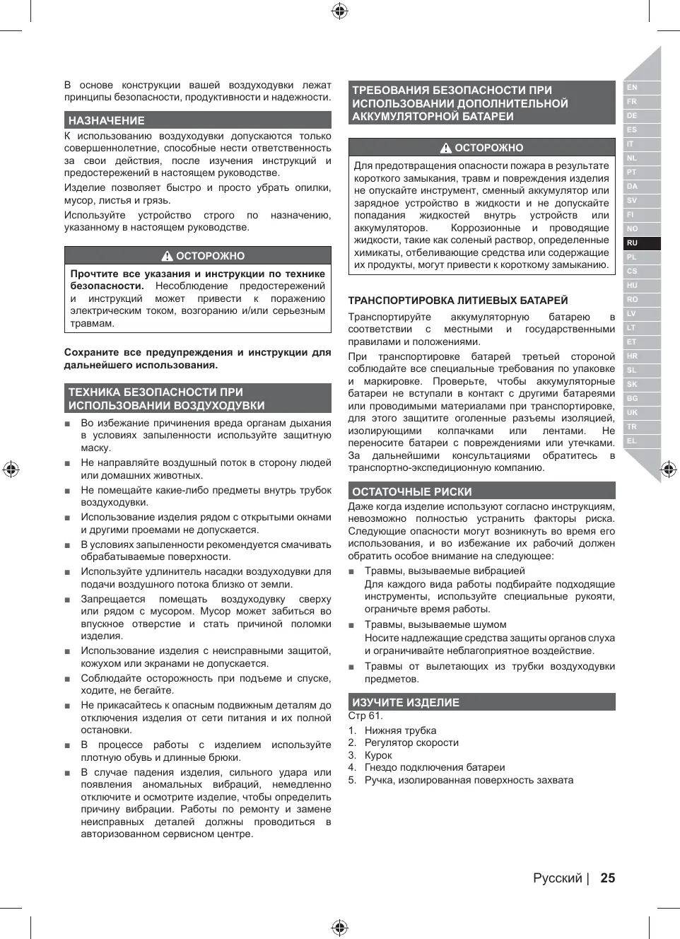 = Blessures dues aux vibrations Toujours utiliser l'outil adapté à la tâche, utiliser les poignées désignées et limiter le temps de fonctionnement et d'exposition = Blessures dues au bruit Portez une protection auditive adaptée et limitez le temps d'exposition = Blessure provoquée par des objets envoyés par le flux du tube du souffleur.