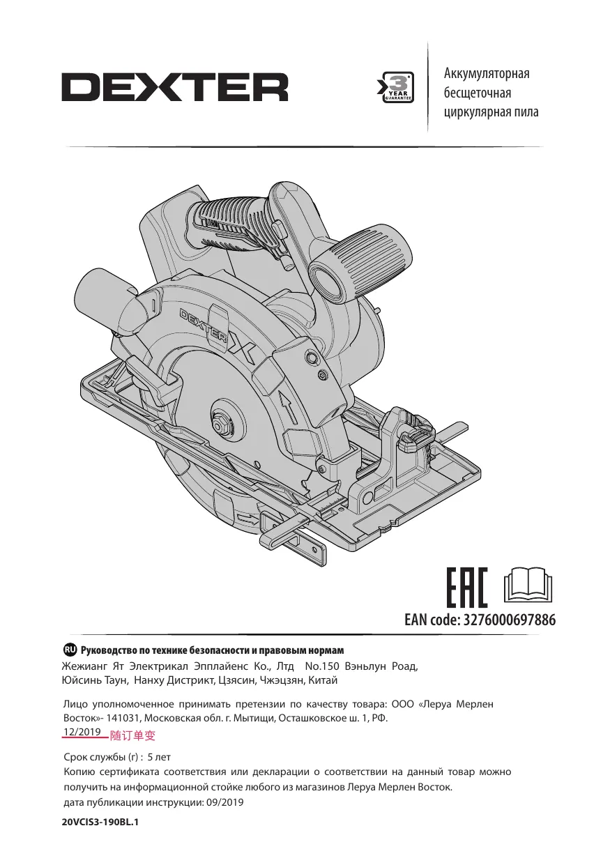 UP20 BRUSHLESS - 20VCIS3-190BL.1 - Беспроводная циркулярная пила DEXTER - Бесплатное руководство пользователя