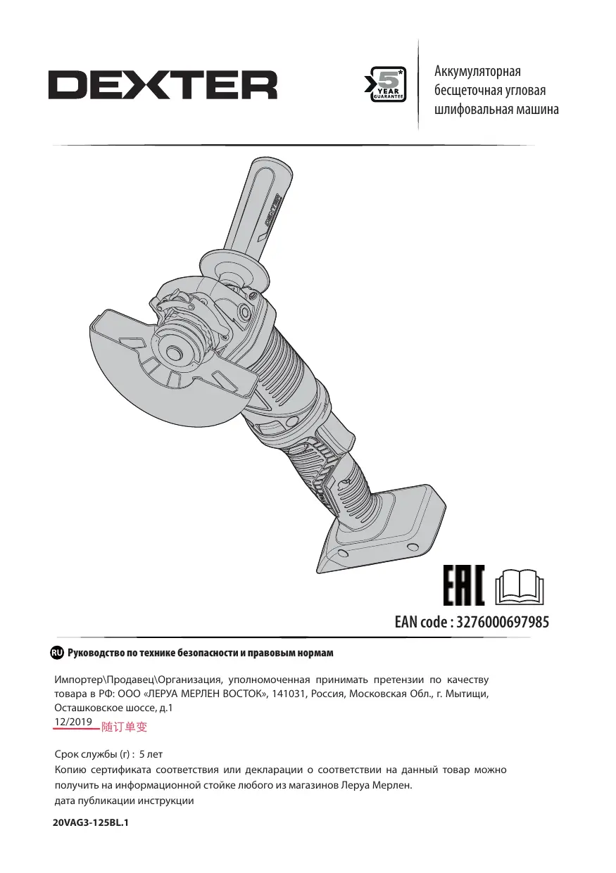 РУКОВОДСТВО ПОЛЬЗОВАТЕЛЯ 20VAG3-125BL.1 DEXTER