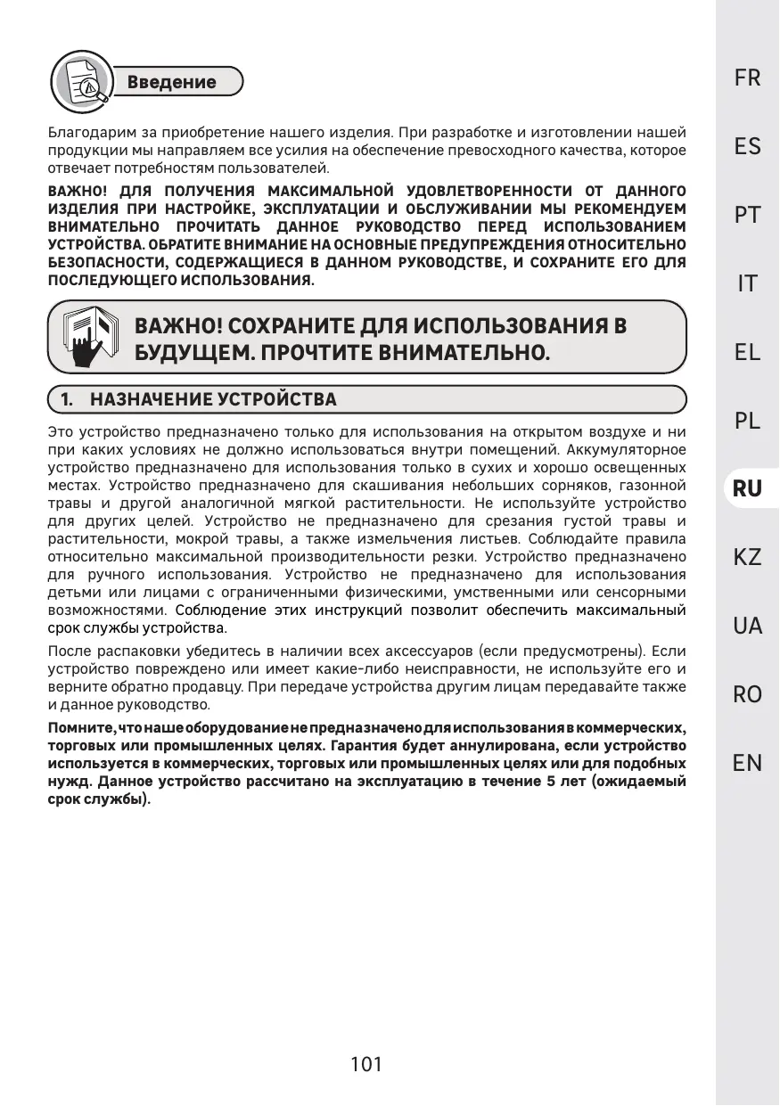 Le produit doit être utilisé dans des conditions normales d'utilisation et à des finalités non professionnelles. Par conséquent, sont exclus de cette garantie les produits utilisés par les entreprises de jardinage, les administrations Locales, ainsi que les entreprises proposant des services de Location payante ou de prêt gratuit d'équipements.