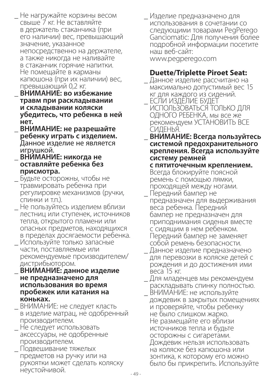 Скачайте инструкцию для вашего Poussettes doubles в формате PDF бесплатно! Найдите своё руководство DUETTE PIROET - PEG PEREGO и возьмите своё электронное устройство обратно в руки. На этой странице опубликованы все документы, необходимые для использования вашего устройства. DUETTE PIROET бренда PEG PEREGO.
