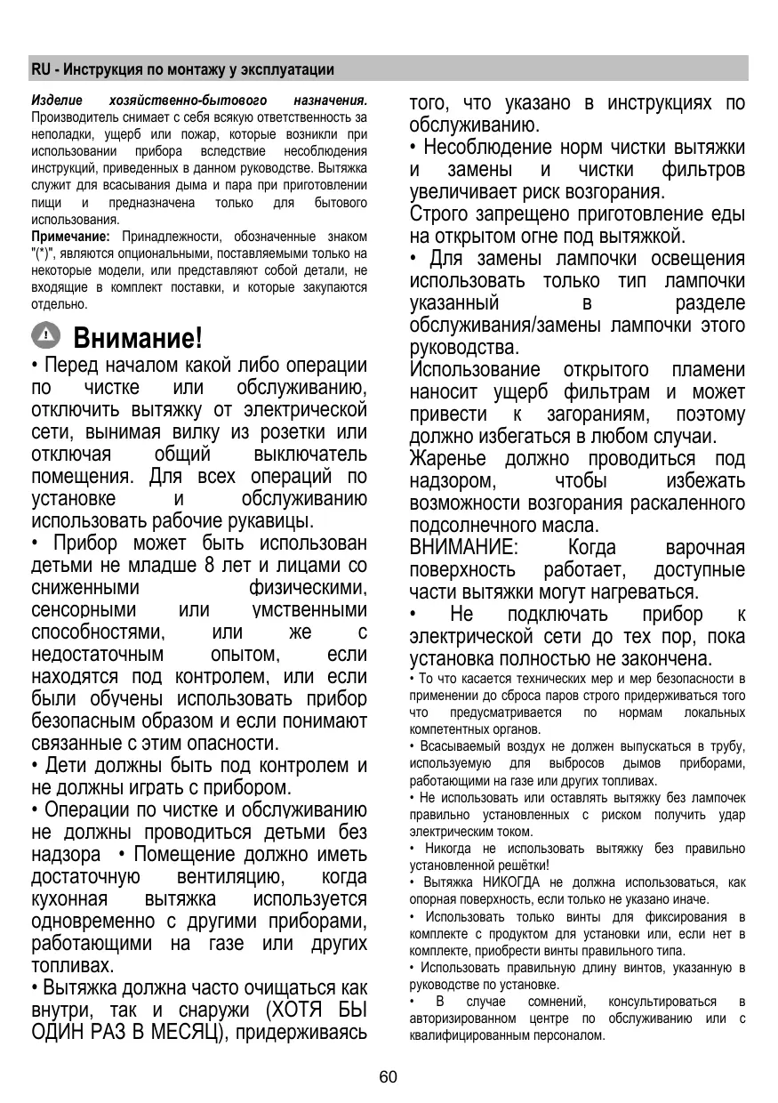 РУКОВОДСТВО ПОЛЬЗОВАТЕЛЯ MISSY IX/A/60 ELICA