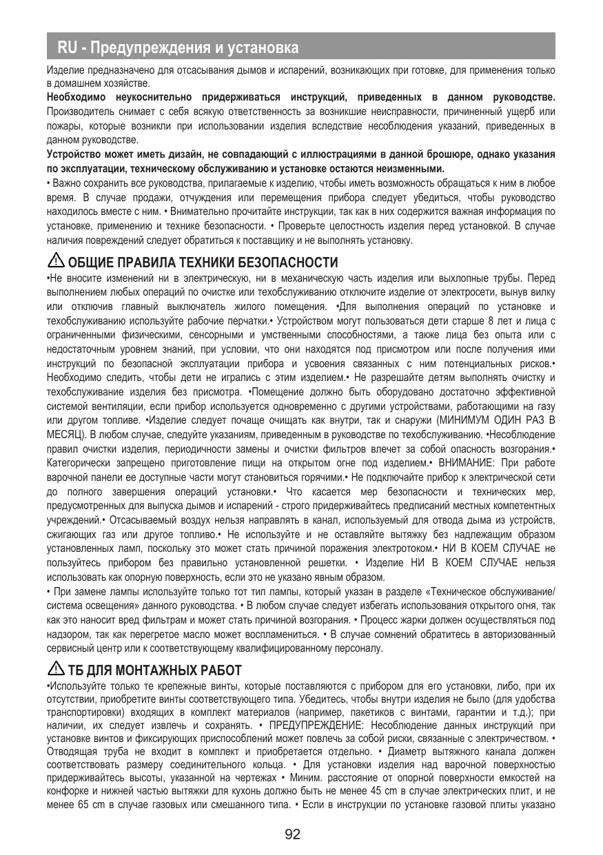 Stictement interdit de faire flamber des aliments sous le produit.» ATTENTION : Lorsque la plaque de cuisson est en marche, les paries accessibles du produit peuvent devenir chaudes.+ Ne pas brancher le produit au secteur électrique tant que l'installation n'est pas totalement terminée.+ Concemant les mesures techniques et de sécurité à prendre pour l'évacuation des fumées, respecter scrupuleusement les règlementations établies par les autorités locales compétentes.» L'air aspiré ne doi pas être conduit vers le tube destiné à l'évacuation des fumées des appareils à combustion à gaz où autres combustibles.» Ne pas utiliser ni laisser le produit sans que les ampoules ne soient correctement montées en raison du risque possible de décharge électrique. Le produit ne doit JAMAIS être utilisé sans la grille correctement montée. + Le produit ne doit JAMAIS être utlisé comme plan à moins que cela ne soit explicitement indiqué.