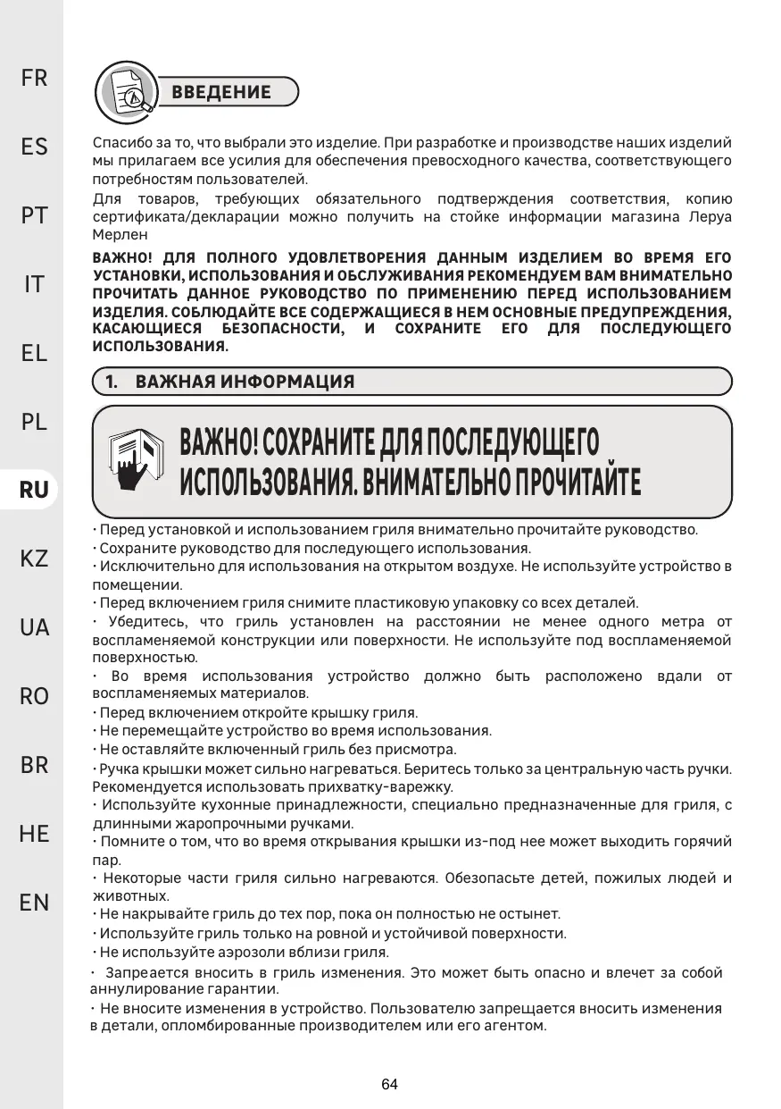 + Toutes modifications de ce barbecue peuvent être dangereuses, ne sont pas autorisées et annulent la garantie.