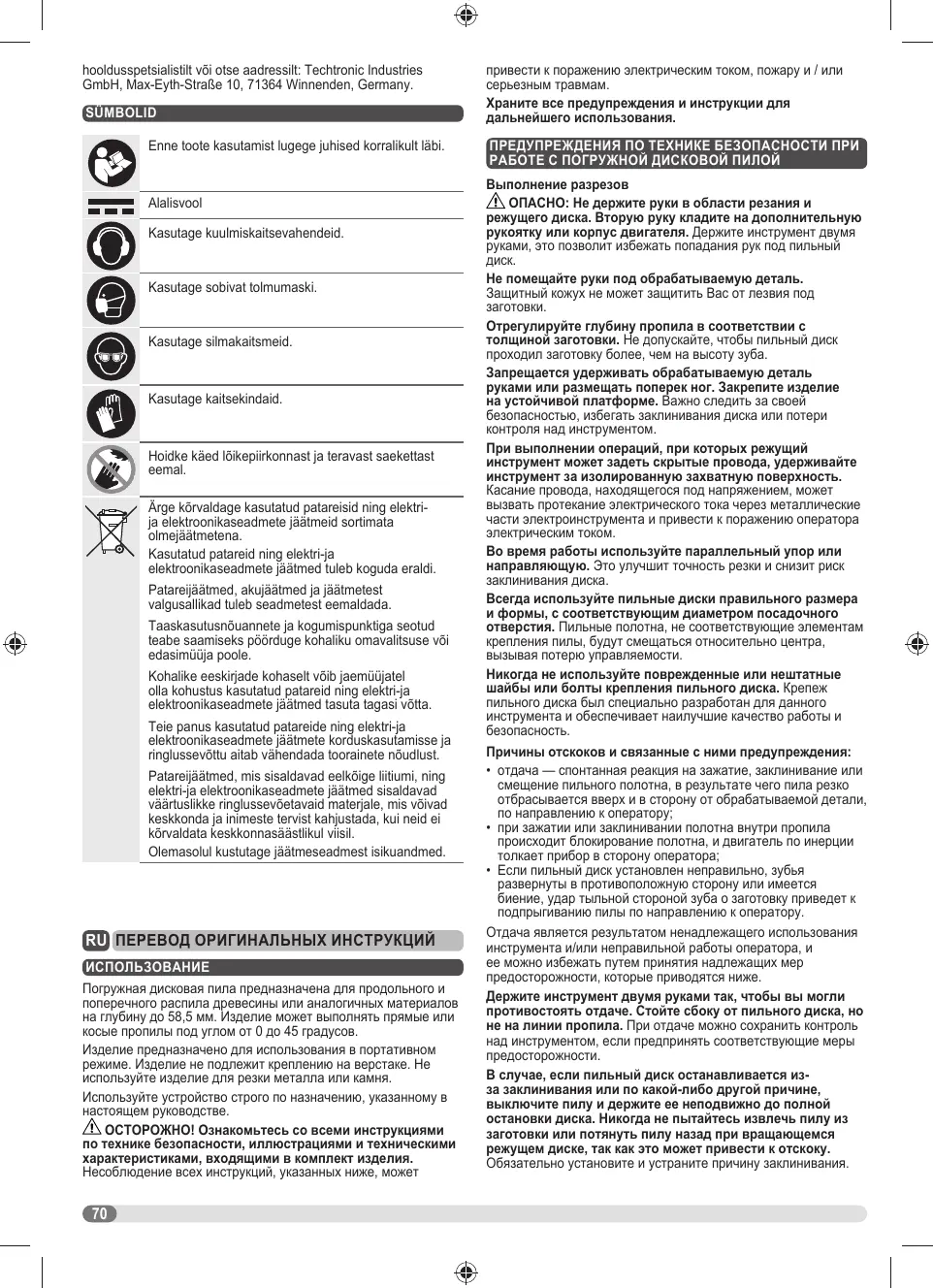 BKS18PBL-0 - Scie circulaire plongeante AEG - Бесплатное руководство пользователя