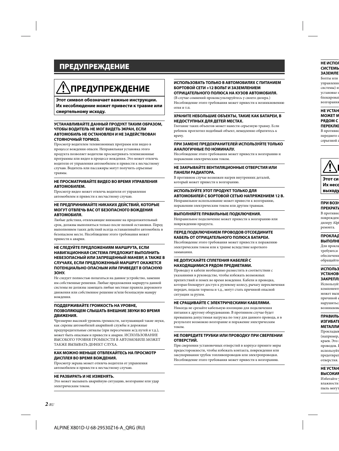 ПОДДЕРЖИВАЙТЕ ГРОМКОСТЬ НА УРОВНЕ, ПОЗВОЛЯЮЩЕМ СЛЫШАТЬ ВНЕШНИЕ ЗВУКИ ВО ВРЕМЯ Чрезмерно высокий уровень громкости, заглушающий такие звуки, как сирены автомобилей аварийной службы и дорожные предупредительные сигналы (при пересечении ж/д путей и т.д.), может быть опасным и привести к аварии. ИСПОЛЬЗОВАНИЕ ВЫСОКОГО УРОВНЯ ГРОМКОСТИ В АВТОМОБИЛЕ МОЖЕТ ТАКЖЕ ВЫЗЫВАТЬ ДЕФЕКТ СЛУХА. КАК МОЖНО МЕНЬШЕ ОТВЛЕКАЙТЕСЬ НА ПРОСМОТР ДИСПЛЕЯ ВО ВРЕМЯ ВОЖДЕНИЯ. Просмотр экрана может отвлечь водителя от управления автомобилем и привести к несчастному случаю. НЕ РАЗБИРАТЬ И НЕ ИЗМЕНЯТЬ. Это может вызывать аварийную ситуацию, возгорание или удар электрическим током. 2-RU ALPINE X801D-U 68-29530Z16-A_QRG (RU) ИСПОЛЬЗОВАТЬ ТОЛЬКО В АВТОМОБИЛЯХ С ПИТАНИЕМ БОРТОВОЙ СЕТИ +12 ВОЛЬТ И ЗАЗЕМЛЕНИЕМ ОТРИЦАТЕЛЬНОГО ПОЛЮСА НА КУЗОВ АВТОМОБИЛЯ. (В случае сомнений проконсультируйтесь у своего дилера.) Несоблюдение этого требования может привести к возникновению огня и т.п. ХРАНИТЕ НЕБОЛЬШИЕ ОБЪЕКТЫ, ТАКИЕ КАК БАТАРЕИ, В НЕДОСТУПНЫХ ДЛЯ ДЕТЕЙ МЕСТАХ. Глотание таких объектов может нанести серьезную травму. Если ребенок проглотил подобный объект, немедленно обратитесь к