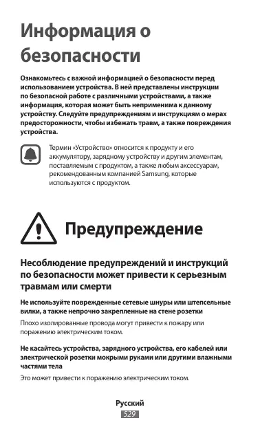 Информация о безопасности Ознакомьтесь с важной информацией о безопасности перед использованием устройства. В ней представлены инструкции по безопасной работе с различными устройствами, а также информация, которая может быть неприменима к данному устройству. Следуйте предупреждениям и инструкциям о мерах предосторожности, чтобы избежать травм, а также повреждения устройства. Термин «Устройство» относится к продукту и его аккумулятору, зарядному устройству и другим элементам, поставляемым с продуктом, а также любым аксессуарам, рекомендованным компанией Samsung, которые используются с продуктом. Предупреждение Несоблюдение предупреждений и инструкций по безопасности может привести к серьезным травмам или смерти Не используйте поврежденные сетевые шнуры или штепсельные вилки, а также непрочно закрепленные на стене розетки Плохо изолированные провода могут привести к пожару или поражению электрическим током. Не касайтесь устройства, зарядного устройства, его кабелей или электрической розетки мокрыми руками или другими влажными частями тела Это может привести к поражению электрическим током.