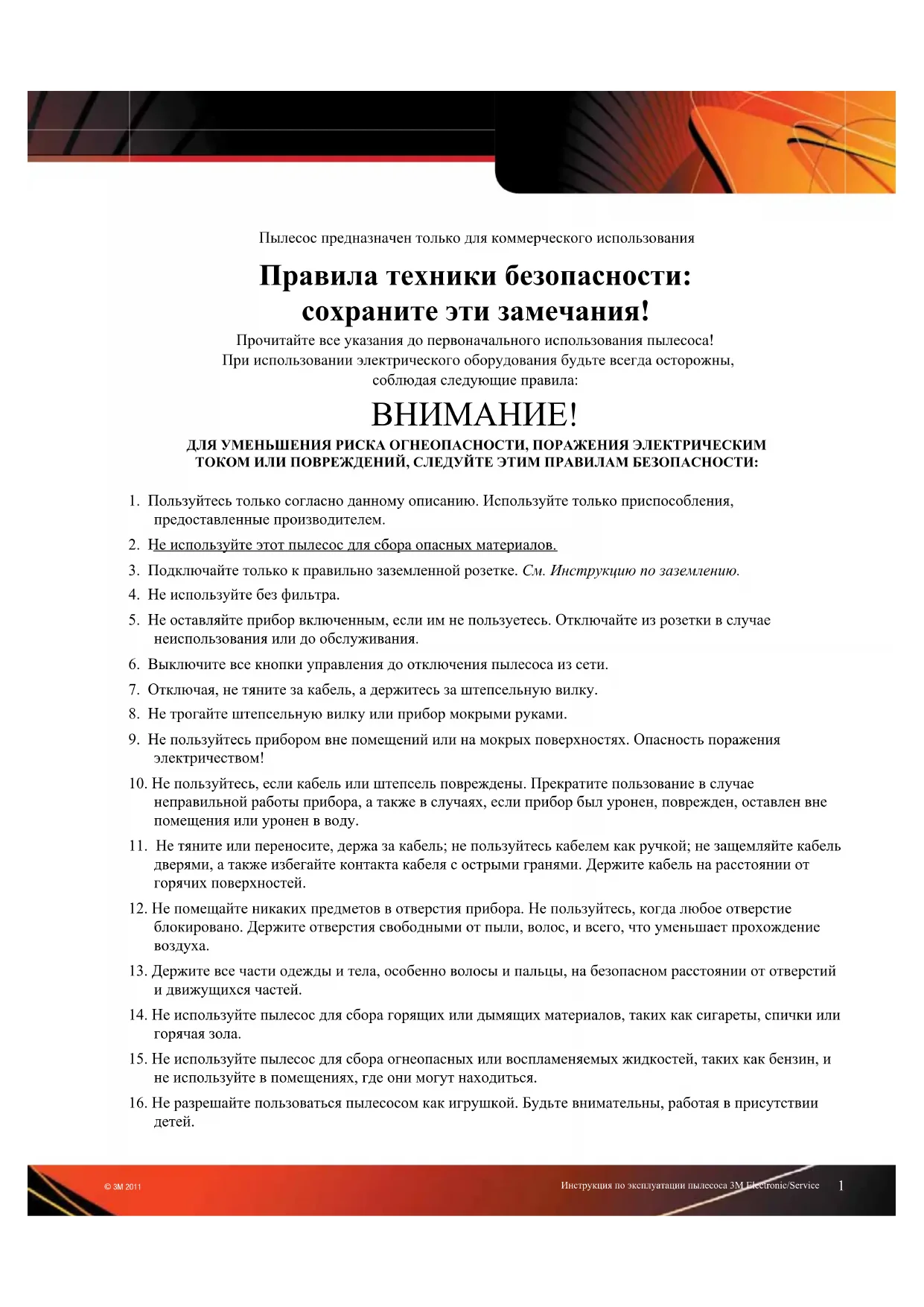 Инструкция по эксплуатации пылесоса 3М Electronic/Service © 3M 2011 Пылесос предназначен только для коммерческого использования