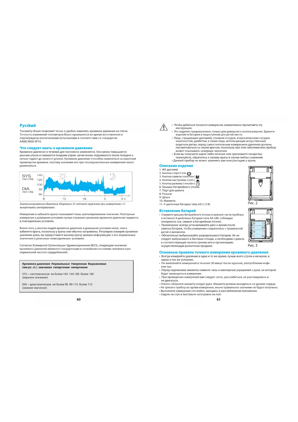 - Данный прибор не может заменить вам консультацию у врача. Pуcckий Тонометр Braun позволяет точно и удобно изменять кровяное давление на плече. Точность изменений тонометров Braun проверяется во время изготовления и подтверждена клиническими испытаниями в соответствии со стандартом AAMI/ANSI-SP10. Что следует знать о кровяном давлении Кровяное давление в течение дня постоянно изменяется. Оно резко повышается ранним утром и снижается поздним утром. затем вновь поднимается после полудня и ночью падает до низкого уровня. Кровяное давление способно изменяться за короткий промежуток времени. поэтому значения его при последовательных измерениях могут различаться. Значения кровяного давления здорового 31-летнего мужчины при измерениях с 5- минутными интервалами Измерение в кабинете врача показывает лишь кратковременное значение. Повторные измерения в домашних условиях лучше отражают реальное кровяное давление пациента в повседневных условиях. Более того, у многих людей кровяное давление в домашних условиях иное, чем в кабинете врача, поскольку у врача они обычно напряжены. Регулярно измеряя кровяное давление дома, вы предоставите вашему врачу ценную информацию о его нормальных значениях в реальных «повседневных» условиях. Согласно Всемирной Организации Здравоохранения (ВОЗ), следующие значения кровяного давления являются стандартными в спокойном состоянии человека (при нормальной частоте сердцебиений). Кровяное давление Нормальные Умеренная Выраженная (мм рт. ст.) значения гипертония гипертония SYS = систолическое не более 140 140-180 более 180 (верхнее значение) DIA = диастолическое не более 90 90-110 более 110 (нижнее значение) M62