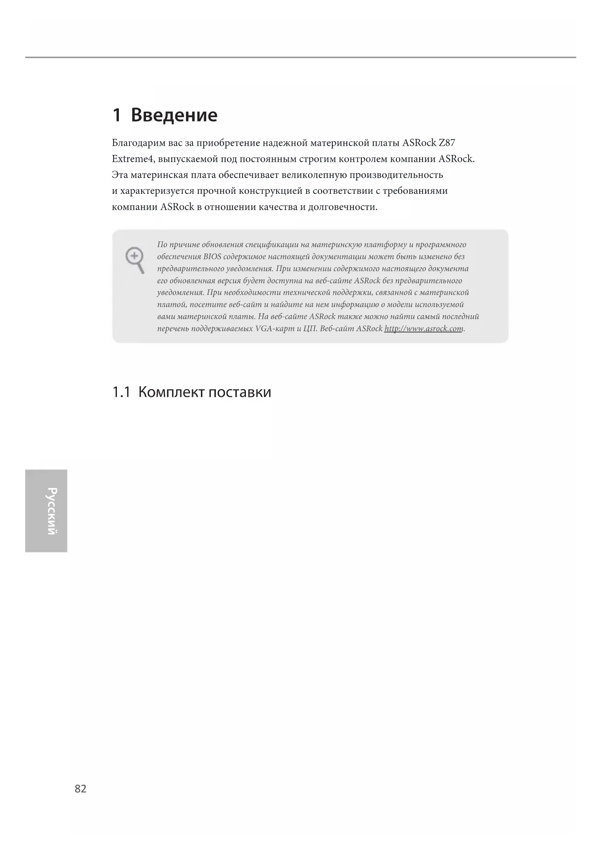 1 Введение Благодарим вас за приобретение надежной материнской платы ASRock Z87 Extreme4, выпускаемой под постоянным строгим контролем компании ASRock. Эта материнская плата обеспечивает великолепную производительность и характеризуется прочной конструкцией в соответствии с требованиями компании ASRock в отношении качества и долговечности.