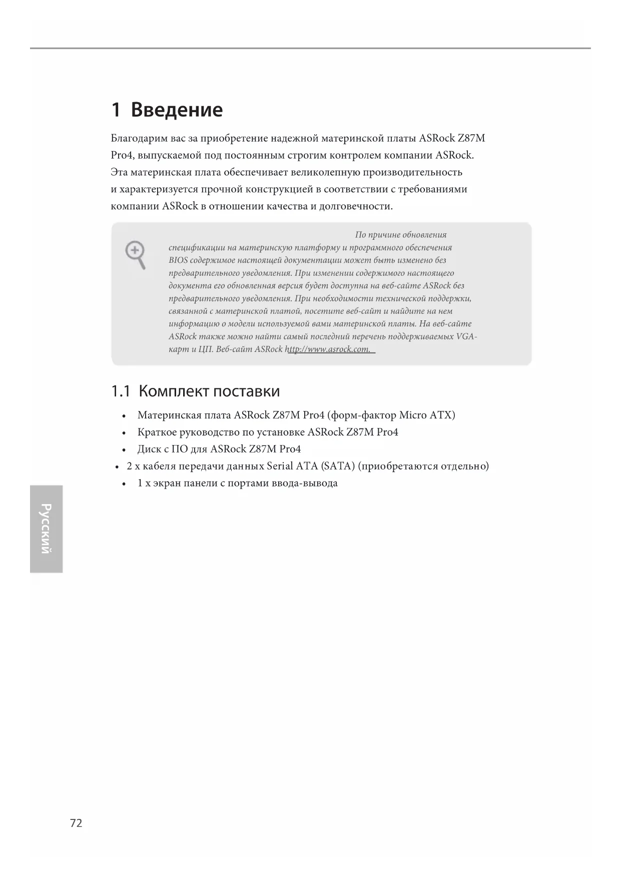 Благодарим вас за приобретение надежной материнской платы ASRock Z87M Pro4, выпускаемой под постоянным строгим контролем компании ASRock.
