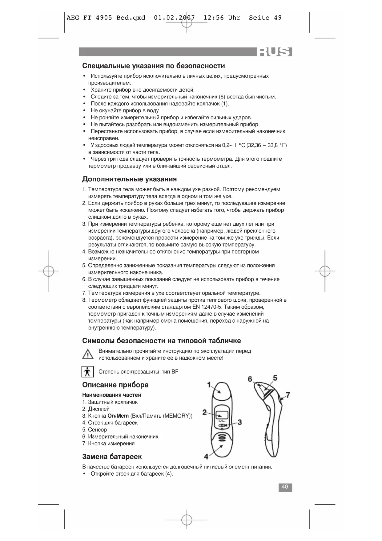 AEG_FT_4905_Bed.qxd 01.02.2007 12:56 Uhr Seite 49• Замените элемент питания батарейкой такого же типа, соблюдая правильную