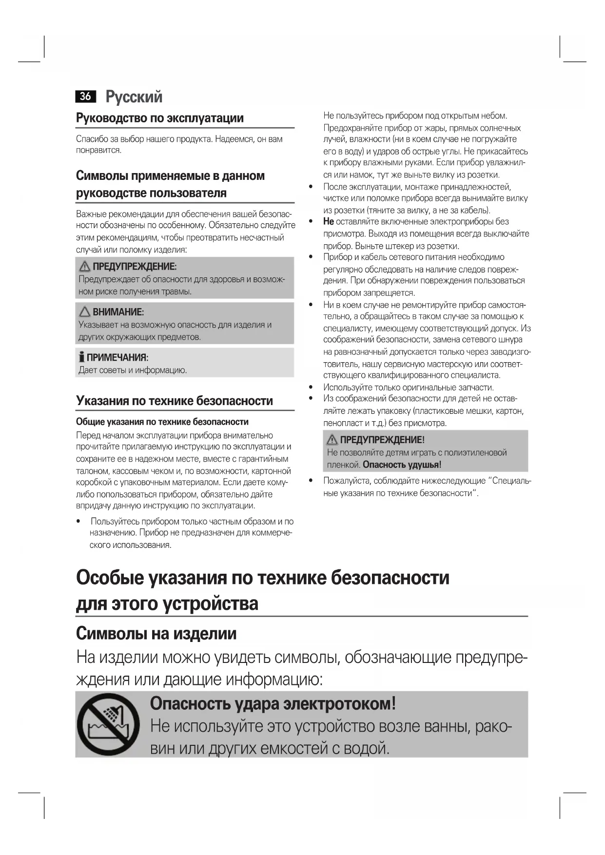 Руководство по эксплуатации Спасибо за выбор нашего продукта. Надеемся, он вам понравится. Символы применяемые в данном руководстве пользователя Важные рекомендации для обеспечения вашей безопас-ности обозначены по особенному. Обязательно следуйте этим рекомендациям, чтобы преотвратить несчастный случай или поломку изделия: ПРЕДУПРЕЖДЕНИЕ:Предупреждает об опасности для здоровья и возмож-ном риске получения травмы. ВНИМАНИЕ:Указывает на возможную опасность для изделия и других окружающих предметов. ПРИМЕЧАНИЯ:Дает советы и информацию. Указания по технике безопасности Общие указания по технике безопасностиПеред началом эксплуатации прибора внимательно прочитайте прилагаемую инструкцию по эксплуатации и сохраните ее в надежном месте, вместе с гарантийным талоном, кассовым чеком и, по возможности, картонной коробкой с упаковочным материалом. Если даете кому-либо попользоваться прибором, обязательно дайте впридачу данную инструкцию по эксплуатации.• Пользуйтесьприборомтолькочастнымобразомипоназначению. Прибор не предназначен для коммерче-ского использования. Не пользуйтесь прибором под открытым небом. Предохраняйте прибор от жары, прямых солнечных лучей, влажности (ни в коем случае не погружайте его в воду) и ударов об острые углы. Не прикасайтесь к прибору влажными руками. Если прибор увлажнил-ся или намок, тут же выньте вилку из розетки.• Послеэксплуатации,монтажепринадлежностей,чистке или поломке прибора всегда вынимайте вилку из розетки (тяните за вилку, а не за кабель).• Не оставляйте включенные электроприборы без присмотра. Выходя из помещения всегда выключайте прибор. Выньте штекер из розетки.• Приборикабельсетевогопитаниянеобходиморегулярно обследовать на наличие следов повреж-дения. При обнаружении повреждения пользоваться прибором запрещяется.• Нивкоемслучаенеремонтируйтеприборсамостоя-тельно, а обращайтесь в таком случае за помощью к специалисту, имеющему соответствующий допуск. Из соображений безопасности, замена сетевого шнура на равнозначный допускается только через заводизго-товитель, нашу сервисную мастерскую или соответ-ствующего квалифицированного специалиста. • Используйтетолькооригинальныезапчасти.• Изсоображенийбезопасностидлядетейнеостав-ляйте лежать упаковку (пластиковые мешки, картон, пенопласт и т.д.) без присмотра. ПРЕДУПРЕЖДЕНИЕ!Не позволяйте детям играть с полиэтиленовой пленкой. Опасность удушья!• Пожалуйста,соблюдайтенижеследующие“Специаль-ныеуказанияпотехникебезопасности“. Особые указания по технике безопасности для этого устройства Символы на изделии На изделии можно увидеть символы, обозначающие предупре- ждения или дающие информацию: Опасность удара электротоком! Не используйте это устройство возле ванны, рако- вин или других емкостей с водой.Русский