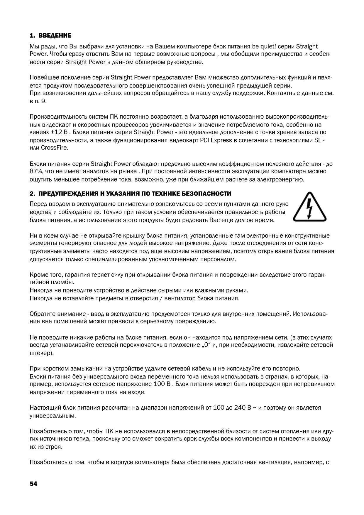ностисерииStraightPowerвданномобширномруководстве. НовейшеепоколениесерииStraightPowerпредоставляетВаммножестводополнительныхфункцийиявля- етсяпродуктомпоследовательногосовершенствованияоченьуспешнойпредыдущейсерии. Привозникновениидальнейшихвопросовобращайтесьвнашуслужбуподдержки.Контактныеданныесм. вп.9. ПроизводительностьсистемПКпостоянновозрастает,аблагодаряиспользованиювысокопроизводитель- ныхвидеокартискоростныхпроцессоровувеличиваетсяизначениепотребляемоготока,особеннона линиях+12В.БлокипитаниясерииStraightPower-этоидеальноедополнениесточкизрениязапасапо производительности,атакжефункционированиявидеокартPCIExpressвсочетаниистехнологиямиSLi- илиCrossFire. БлокипитаниясерииStraightPowerобладаютпредельновысокимкоэффициентомполезногодействия-до 87%,чтонеимеетаналоговнарынке.Припостояннойинтенсивностиэксплуатациикомпьютераможно ощутитьменьшеепотреблениетока,возможно,ужеприближайшемрасчетезаэлектроэнергию.