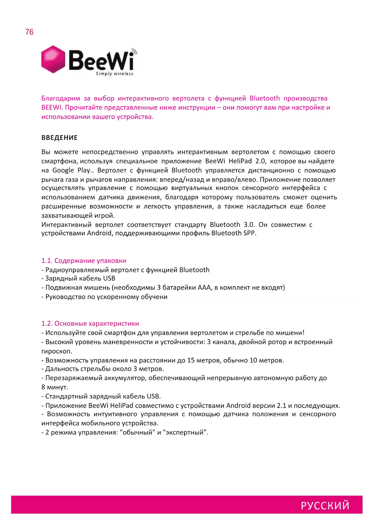 Благодарим за выбор интерактивного вертолета с функцией Bluetooth производства BEEWI. Прочитайте представленные ниже инструкции – они помогут вам при настройке и использовании вашего устройства. PУССКИЙ77 1.3. Презентация продукта Интерактивный вертолет