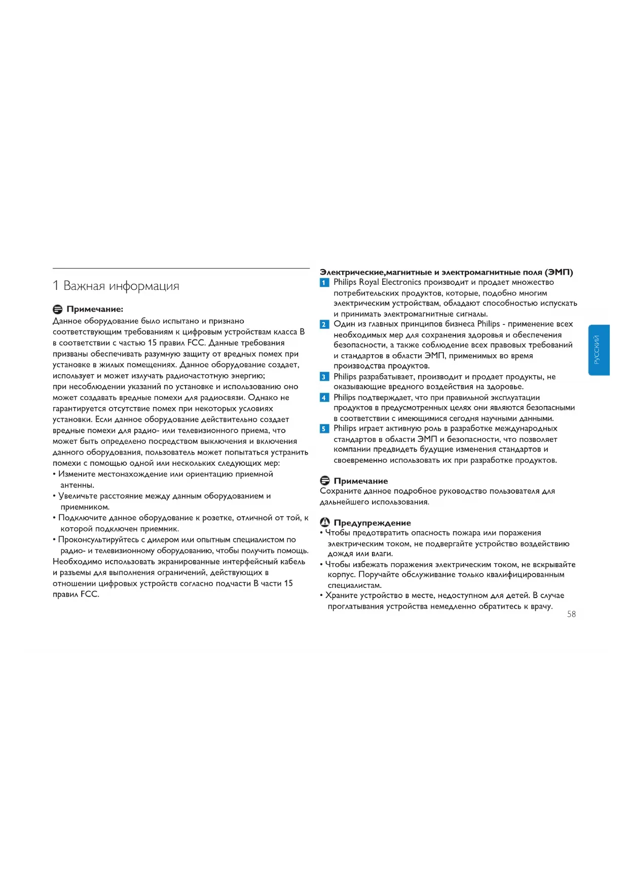 - Проконсультируйтесь с дилером или опытным специалистом по радио- и телевизионному оборудованию, чтобы получить помощь. Необходимо использовать экранированные интерфейсный кабель и разъемы для выполнения ограничений, действующих в отношении цифровых устройств согласно подчасти B части 15 правил FCC. Электрические,магнитные и электромагнитные поля (ЭМП) Philips Royal Electronics производит и продает множество потребительских продуктов, которые, подобно многим электрическим устройствам, обладают способностью испускать и принимать электромагнитные сигналы. Один из главных принципов бизнеса Philips - применение всех необходимых мер для сохранения здоровья и обеспечения безопасности, а также соблюдение всех правовых требований и стандартов в области ЭМП, применимых во время производства продуктов. Philips разрабатывает, производит и продает продукты, не оказывающие вредного воздействия на здоровье. Philips подтверждает, что при правильной эксплуатации продуктов в предусмотренных целях они являются безопасными в соответствии с имеющимися сегодня научными данными. Philips играет активную роль в разработке международных стандартов в области ЭМП и безопасности, что позволяет компании предвидеть будущие изменения стандартов и своевременно использовать их при разработке продуктов.