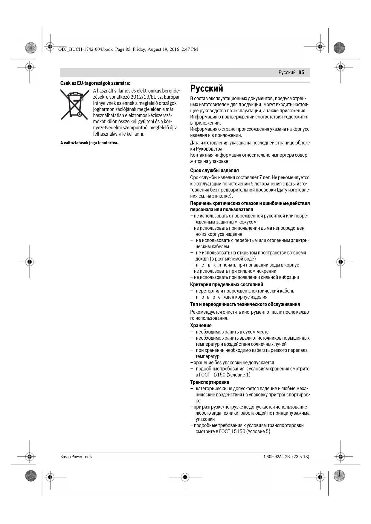 – подробные требования к условиям транспортировки смотрите в ГОСТ 15150 (Условие 5) OBJ_BUCH-1742-004.book Page 85 Friday, August 19, 2016 2:47 PM86 | Русский 1 609 92A 2GB | (23.5.18) Bosch Power Tools Указания по безопасности Общие указания по технике безопасности для электроинструментов Прочтите все указания и инструкции по технике безопасности. Несоблюдение указаний и инструкций по технике безопасности может стать причиной поражения электрическим током, пожара и тяжелых травм. Сохраняйте эти инструкции и указания для будущего использования. Использованное в настоящих инструкциях и указаниях понятие «электроинструмент» распространяется на элек- троинструмент с питанием от сети (с сетевым шнуром) и на аккумуляторный электроинструмент (без сетевого