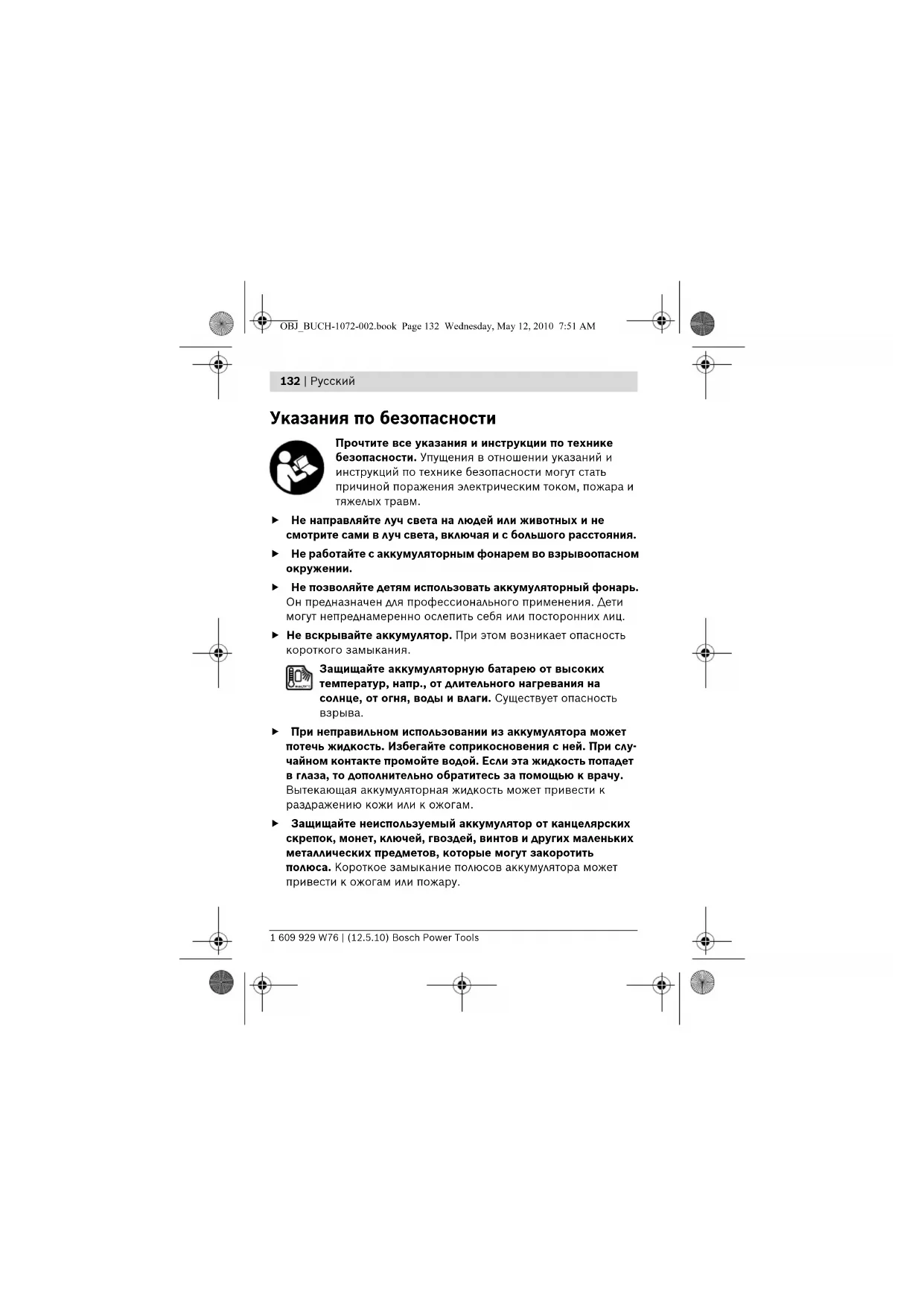 Вставьте заряженный аккумулятор 3 в рукоятку до фиксации. Аккумулятор должен плотно прилегать к ручке. Включение/выключение f Луч света аккумуляторного фонаря выходит из головки фонаря 1. Для включения аккумуляторного фонаря нажмите выключатель 2. Для выключения аккумуляторного фонаря снова нажмите выключатель 2. Защита от глубокой разрядки Литиево-ионный аккумулятор защищен от глубокой разрядки системой «Electronic Cell Protection (ECP)». Защитная схема выключает аккумуляторный фонарь при разряженном аккумуляторе. Указания по применению Пружинный зажим для пояса (см. рис. В) С помощью зажима для пояса 5 Вы можете повесить фонарь, например, на пояс. При этом освобождаются обе руки и фонарь в любое время под рукой. OBJ_BUCH-1072-002.book Page 136 Wednesday, May 12, 2010 7:51 AMРусский | 137 Bosch Power Tools 1 609 929 W76 | (12.5.10) Техобслуживание и сервис Техобслуживание и очистка Если аккумулятор больше не работает, то обратитесь, пожалуйста, в авторизованную сервисную мастерскую для электроинструментов фирмы Bosch. Аккумуляторный фонарь не нуждается в обслуживании и не содержит деталей, которые должны быть заменены или подвергнуты техобслуживанию. Для предотвращения повреждения очищайте пластмассовое стекло аккумуляторного фонаря только сухой и мягкой тряпкой. Не используйте никаких очищающих средств или растворителей. Если аккумуляторный фонарь несмотря на тщательные методы изготовления и испытания выйдет из строя, то ремонт следует поручить авторизованной сервисной мастерской для электроинструментов фирмы Bosch. Пожалуйста, при любых запросах и заказах запчастей обязательно указывайте 10-значный товарный номер по заводской табличке аккумуляторного фонаря. Сервиснoe обслуживаниe и консультация покупатeлeй Сервисный отдел ответит на все Ваши вопросы по ремонту и обслуживанию Вашего продукта и также по запчастям. Монтажные чертежи и информацию по запчастям Вы найдете также по адресу: www.bosch-pt.com Коллектив консультантов Bosch охотно поможет Вам в вопросах покупки, применения и настройки продуктов и принадлежностей. OBJ_BUCH-1072-002.book Page 137 Wednesday, May 12, 2010 7:51 AM1 609 929 W76 | (12.5.10) Bosch Power Tools 138 | Русский Для региона: Россия, Беларусь, Казахстан Гарантийное обслуживание и ремонт электроинструмента, с соблюдением требований и норм изготовителя производятся на территории всех стран только в фирменных или авторизованных сервисных центрах «Роберт Бош». ПРЕДУПРЕЖДЕНИЕ! Использование контрафактной продукции опасно в эксплуатации, может привести к ущербу Вашего здоровья. Изготовление и распространение контрафактной продукции преследуется по Закону в административном и уголовном порядке.