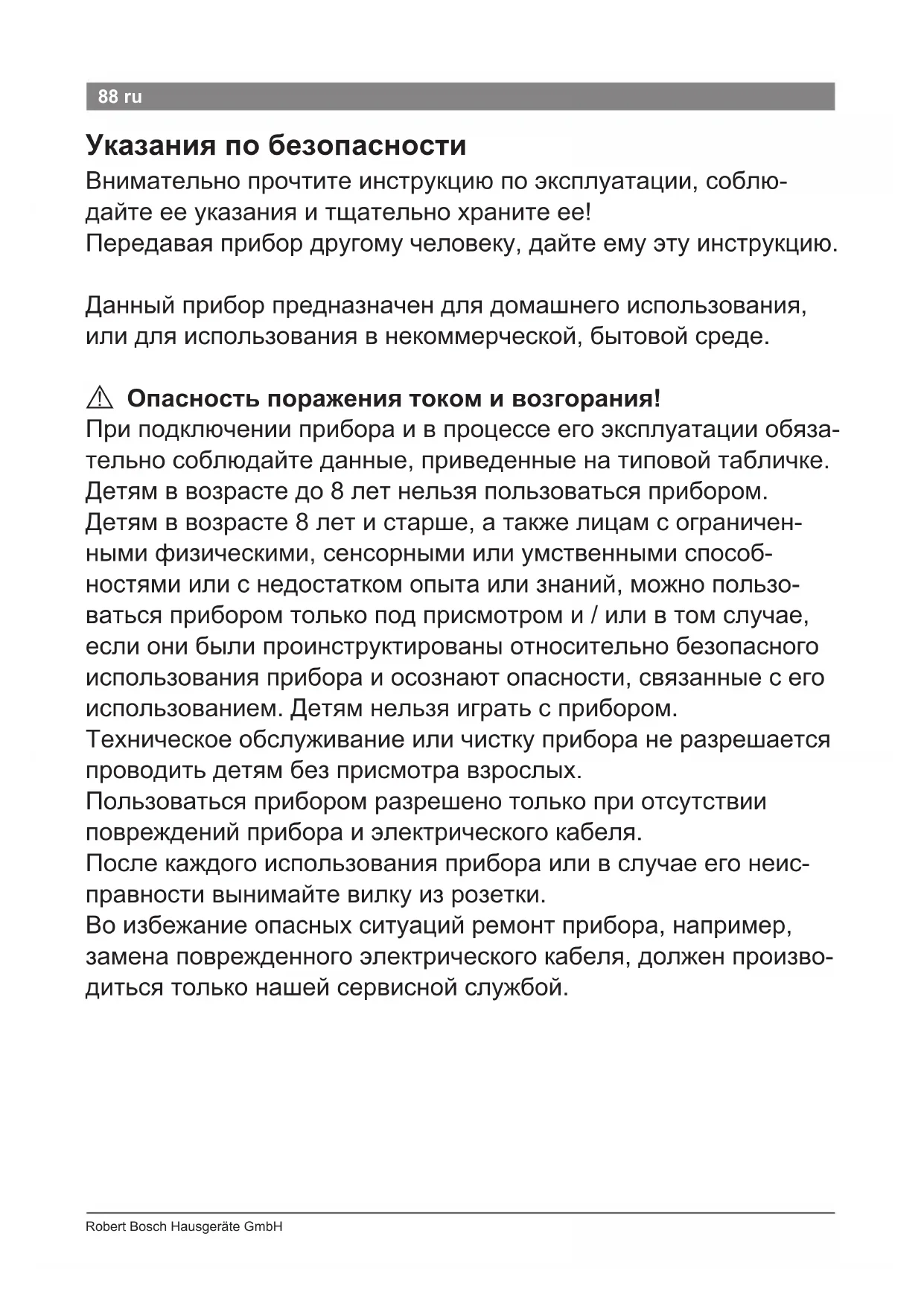 (напруга / частота) 220 – 240 В 50 Гц Потужність нагрівання 39 Вт88 Robert Bosch Hausgeräte GmbH 88 ru Указания по безопасности Внимательно прочтите инструкцию по эксплуатации, соблю- дайте ее указания и тщательно храните ее! Передавая прибор другому человеку, дайте ему эту инструкцию. Данный прибор предназначен для домашнего использования, или для использования в некоммерческой, бытовой среде.