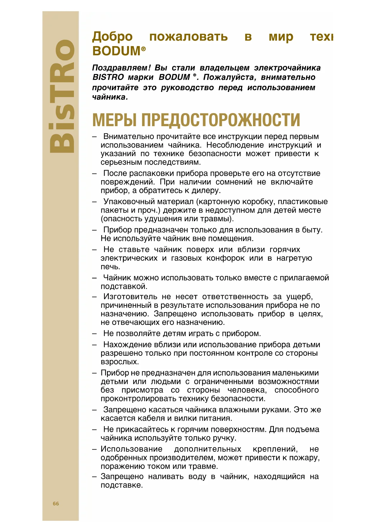 – Запрещено погружать изделие в воду, помните — это электрический прибор. – Очистка прибора выполняется только влажной тканью. – Для отключения выньте вилку из стенной розетки. – При отключении следует тянуть вилку, а не кабель. – Не допускайте свисания кабеля с угла стола или контакта с горячими поверхностями. – Вынимайте кабель из розетки, если чайник не используется, а также во время очистки. Перед очисткой следует дать чайнику остыть. – Не используйте прибор с поврежденным кабелем или вилкой, а также при неисправности или наличии повреждений любого характера. Верните прибор в ближайший сервисный центр для проверки, ремонта или регулировки. – Не пытайтесь самостоятельно заменить кабель питания, для этого необходимы специальные инструменты. Для подтверждения надежности функционирования прибора после замены или ремонта кабеля соответствующая проверка должна быть проведена только в авторизованной сервисной мастерской. – Для предотвращения возгорания, поражения электротоком и получения травм не погружайте кабель, вилку, чайник и подставку в воду или другую жидкость. Внимание! Для гарантированной защиты от поражения током подключайте прибор только к заземленной розетке.68 BisTRo