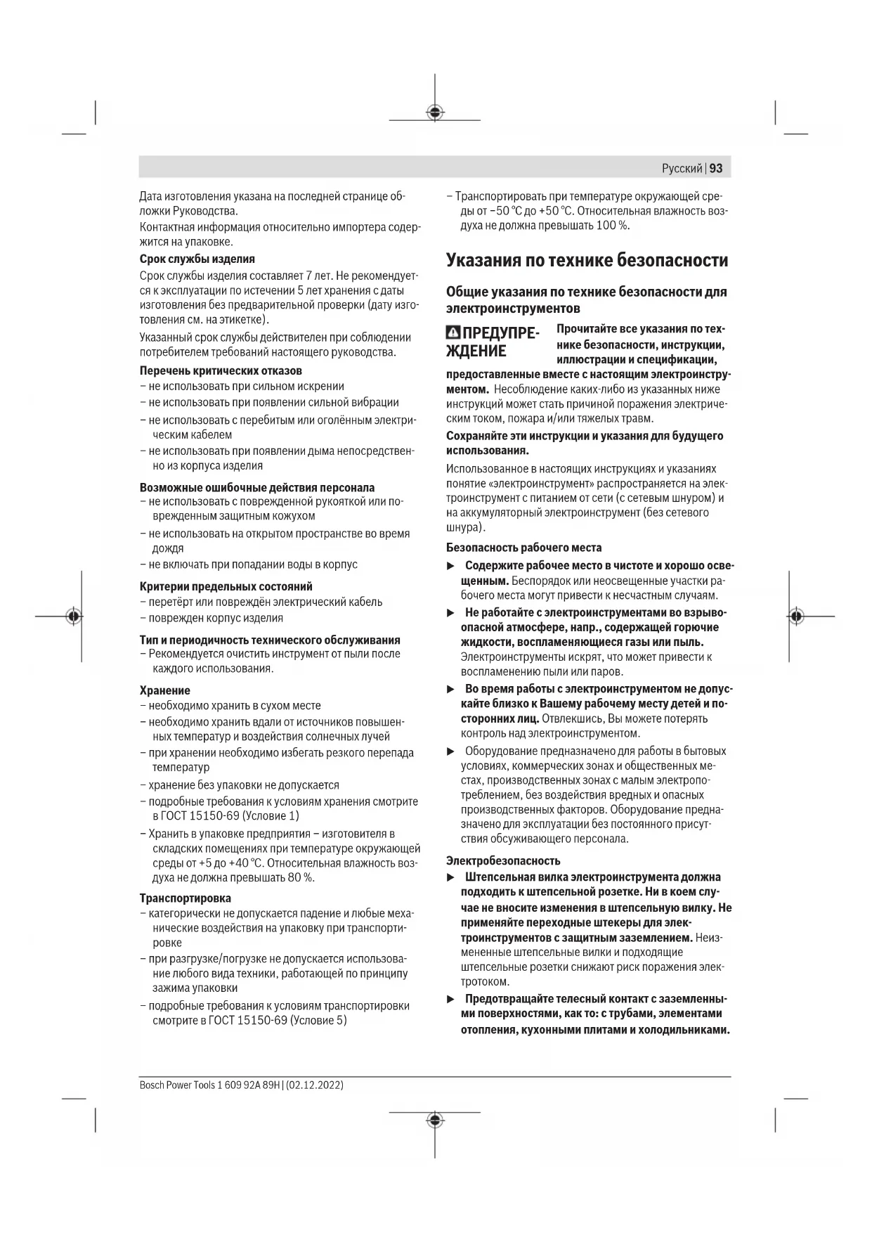 Toлько для стран Евразийского экономического союза (Таможенного союза) В состав эксплуатационных документов, предусмотрен- ных изготовителем для продукции, могут входить настоя- щее руководство по эксплуатации, а также приложения. Информация о подтверждении соответствия содержится в приложении. Информация о стране происхождения указана на корпу- се изделия и в приложении. 1 609 92A 89H | (02.12.2022) Bosch Power ToolsРусский | 93 Дата изготовления указана на последней странице об- ложки Руководства. Контактная информация относительно импортера содер- жится на упаковке. Срок службы изделия Срок службы изделия составляет 7 лет. Не рекомендует- ся к эксплуатации по истечении 5 лет хранения с даты изготовления без предварительной проверки (дату изго- товления см. на этикетке). Указанный срок службы действителен при соблюдении потребителем требований настоящего руководства. Перечень критических отказов – не использовать при сильном искрении – не использовать при появлении сильной вибрации – не использовать с перебитым или оголённым электри- ческим кабелем – не использовать при появлении дыма непосредствен- но из корпуса изделия Возможные ошибочные действия персонала – не использовать с поврежденной рукояткой или по- врежденным защитным кожухом – не использовать на открытом пространстве во время