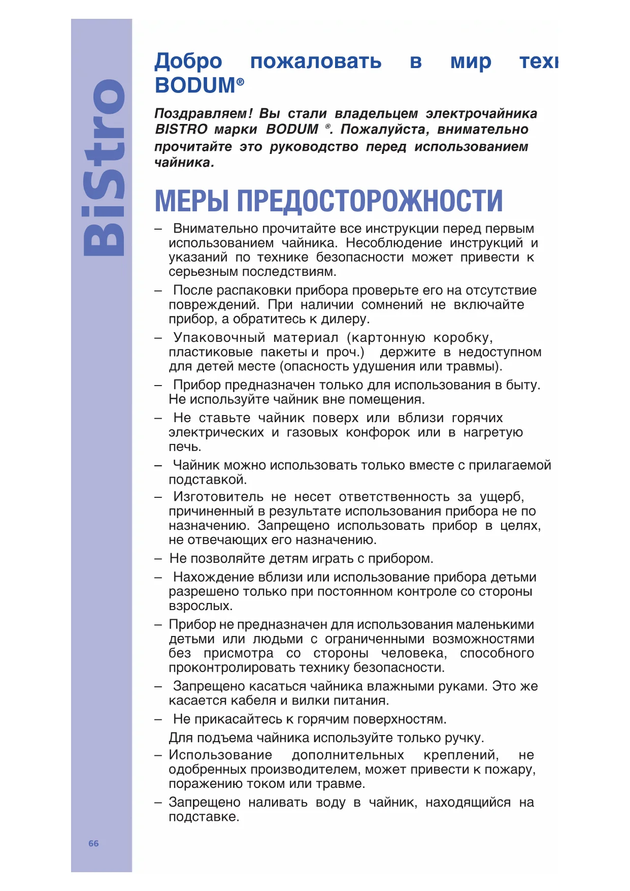 – Запрещено погружать изделие в воду, помните — это электрический прибор. – Очистка прибора выполняется только влажной тканью. – Для отключения поверните выключатель в положение «off» и выньте вилку из розетки. – При отключении следует тянуть вилку, а не кабель. – Не допускайте свисания кабеля с угла стола или контакта с горячими поверхностями. – Вынимайте кабель из розетки, если чайник не используется, а также во время очистки. Перед очисткой следует дать чайнику остыть. – Не используйте прибор с поврежденным кабелем или вилкой, а также при неисправности или наличии повреждений любого характера. Верните прибор в ближайший сервисный центр для проверки, ремонта или регулировки. – Не пытайтесь самостоятельно заменить кабель питания, для этого необходимы специальные инструменты. Для подтверждения надежности функционирования прибора после замены или ремонта кабеля должна быть проведена соответствующая проверка только в авторизованной сервисной мастерской. – Для предотвращения возгорания, поражения электротоком и получения травм не погружайте кабель, вилку, чайник и подставку в воду или другую жидкость.68 BiStro