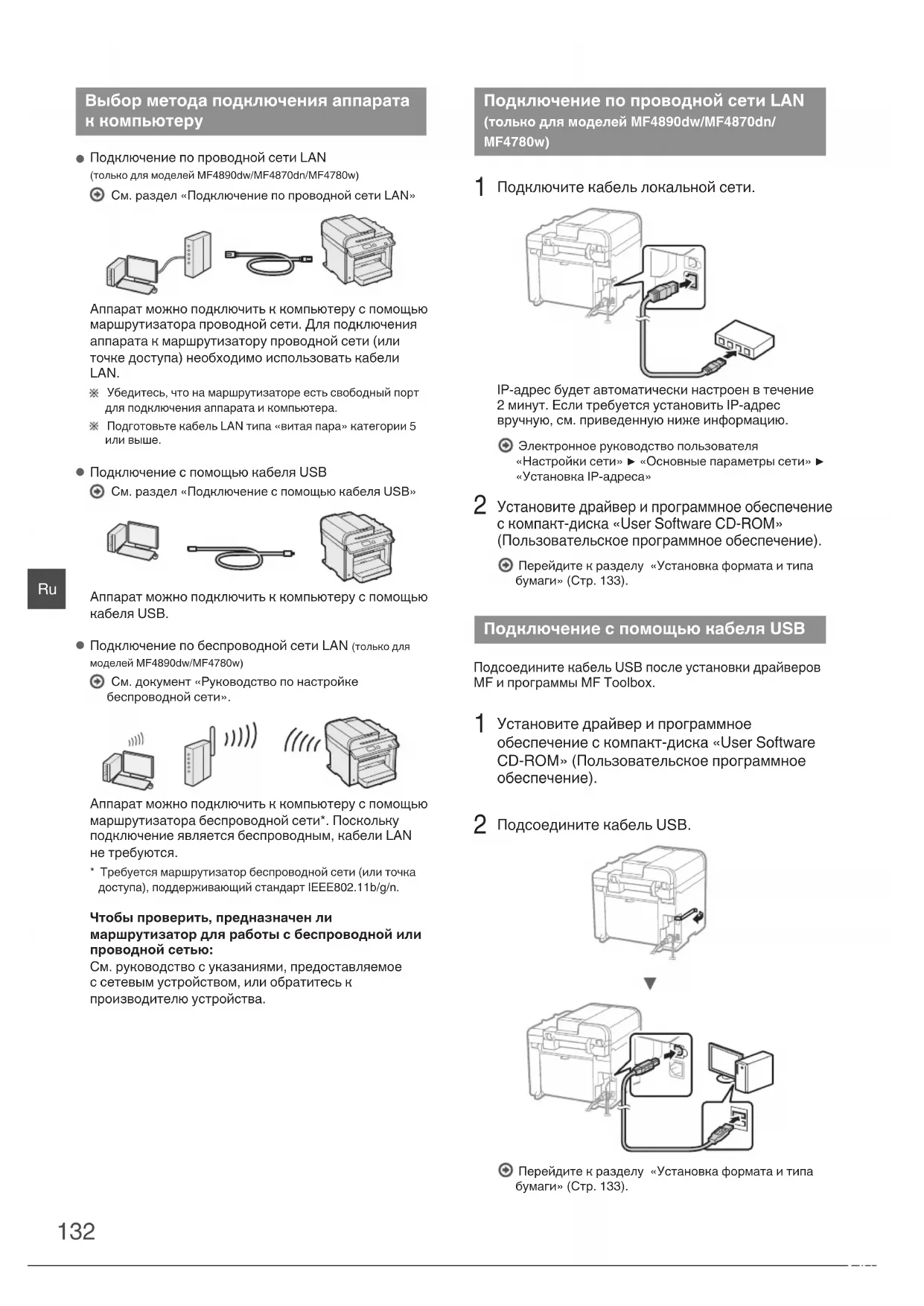 Подключение по беспроводной сети LAN (только для моделей MF4890dw/MF4780w) См. документ «Руководство по настройке беспроводной сети». Аппарат можно подключить к компьютеру с помощью