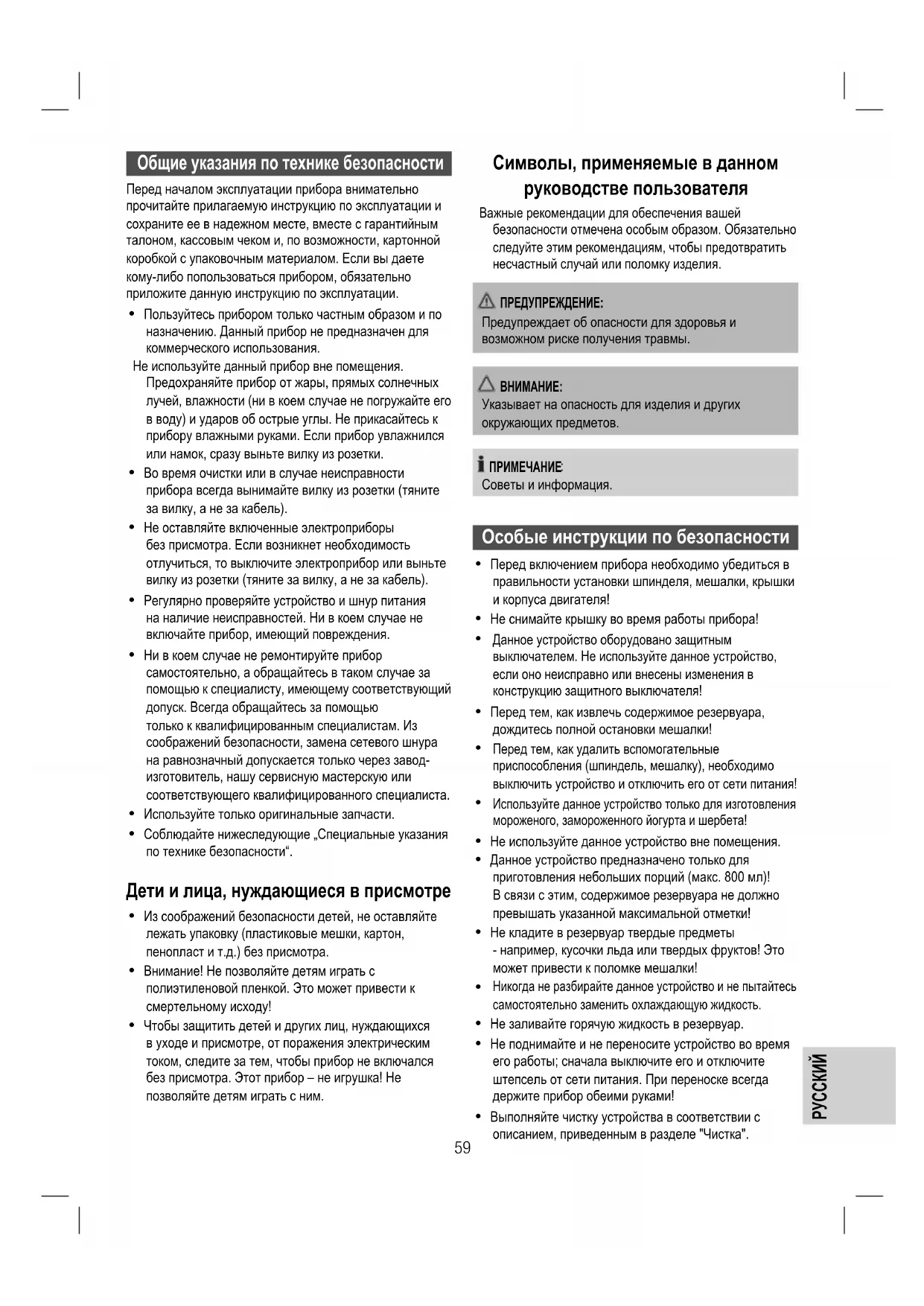 - Соблюдайте нижеследующие „Специальные указания по технике безопасности“. Дети и лица, нуждающиеся в присмотре
