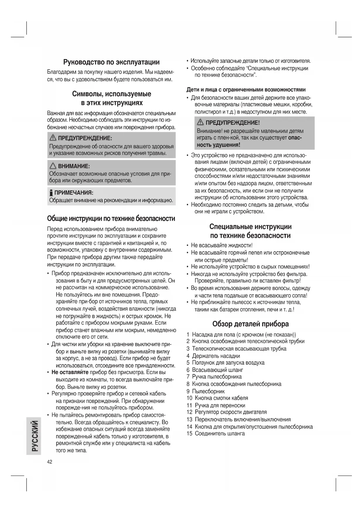 - Не приближайте пылесос к источникам тепла, таким как батареи отопления, печи и т. д.! Обзор деталей прибора 1 Насадка для пола (с крючком (не показан)) 2 Кнопка освобождения телескопической трубки 3 Телескопическая всасывающая трубка 4 Держатель насадки 5 Ползунок для запуска воздуха 6 Всасывающий шланг 7 Ручка пылесборника 8 Кнопка освобождения пылесборника 9 Пылесборник 10 Кнопка смотки кабеля 11 Ручка для переноски 12 Регулятор скорости двигателя 13 Переключатель включения/выключения 14 Кнопка для открытия/опустошения пылесборника 15 Соединитель шланга Руководство по эксплуатации Благодарим за покупку нашего изделия. Мы надеем- ся, что вы с удовольствием будете пользоваться им. Символы, используемые в этих инструкциях Важная для вас информация обозначается специальным образом. Необходимо соблюдать эти инструкции по из- бежание несчастных случаев или повреждения прибора. ПРЕДУПРЕЖДЕНИЕ: Предупреждение об опасности для вашего здоровья и указание возможных рисков получения травмы.