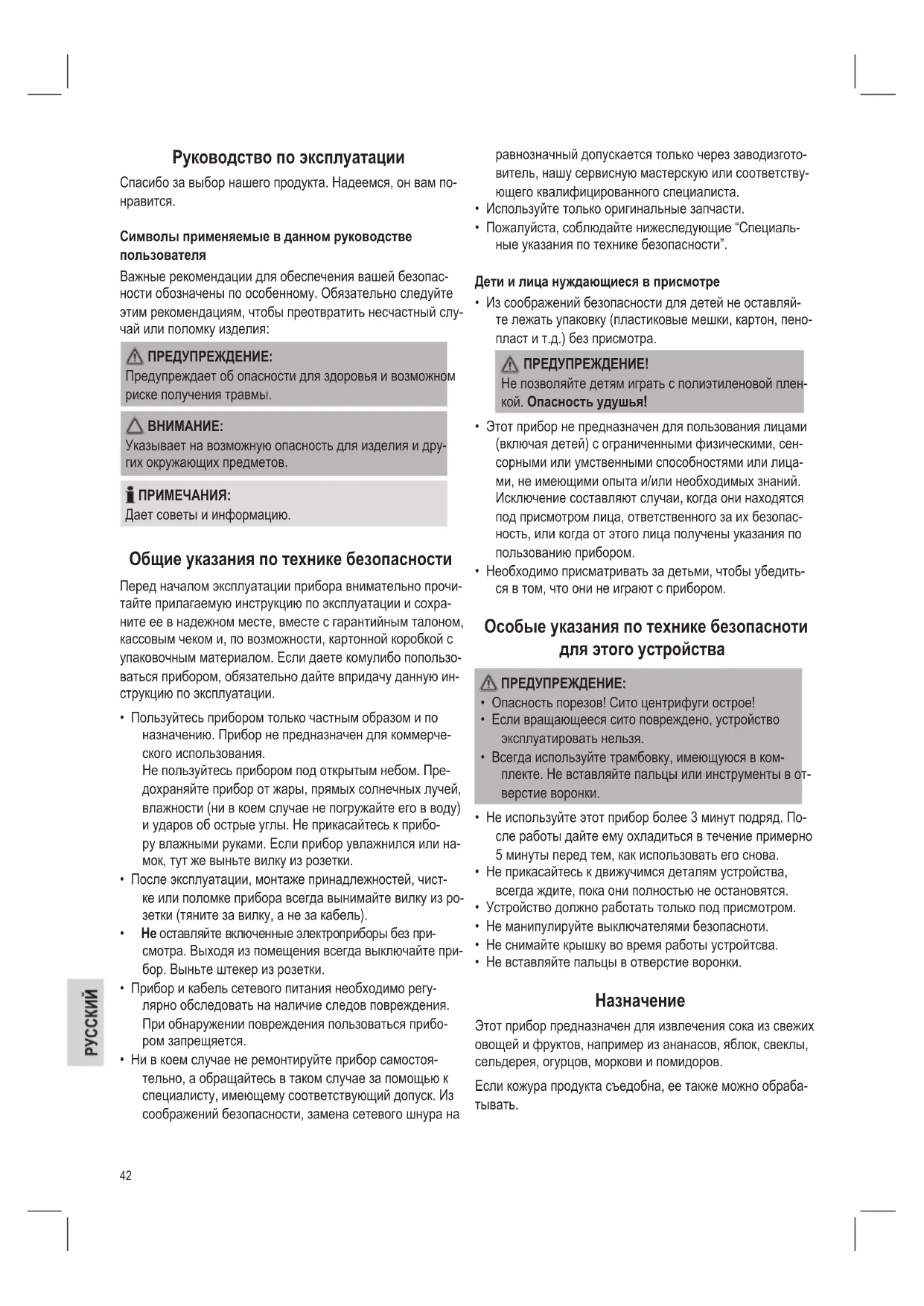 - Удалите крупные косточки и стебли.44 Выжимка сока ПРИМЕЧАНИЯ: Прибор предназначен только для кратковременного ис- пользования. После каждых 3 минут работы делайте па- узу на 5 минут. ПРЕДУПРЕЖДЕНИЕ!