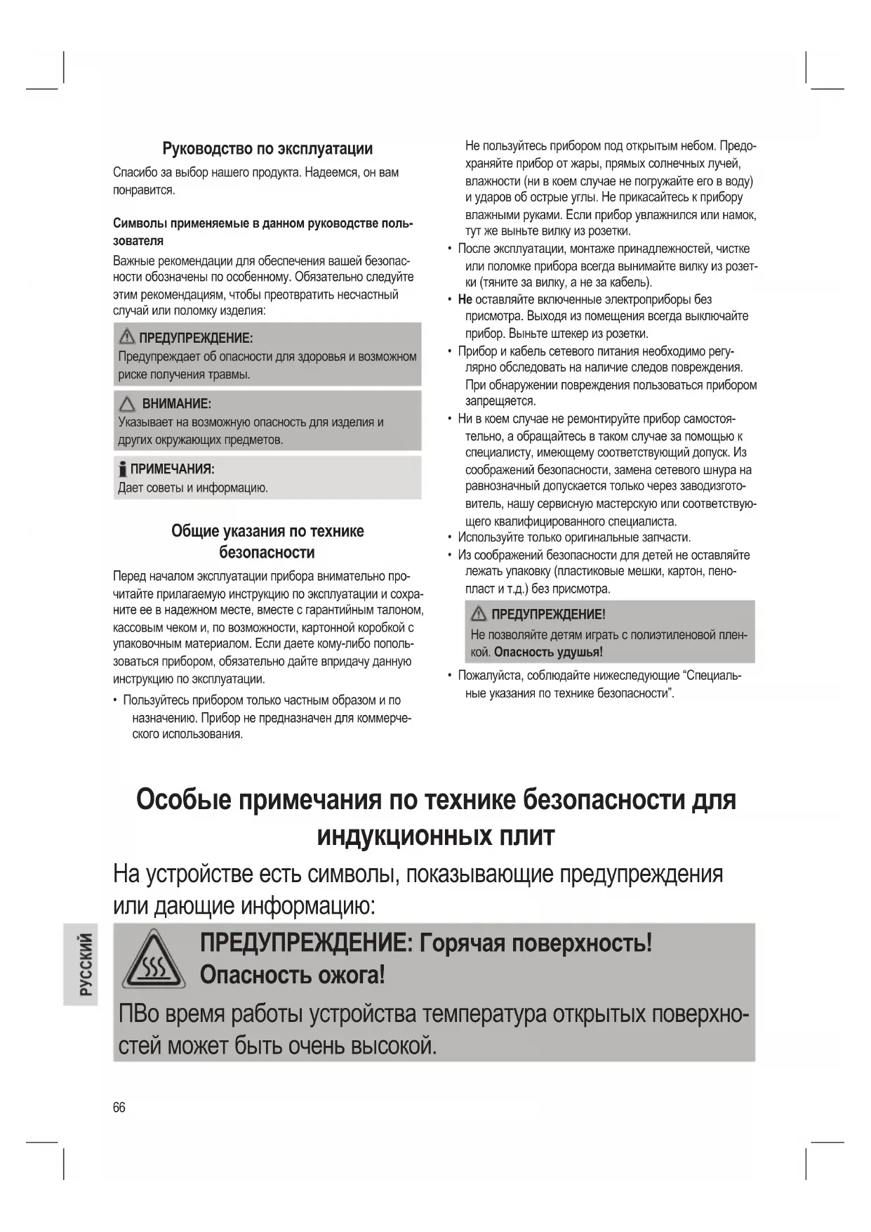 • Горячая поверхность! Индукционная конфорка сначала
