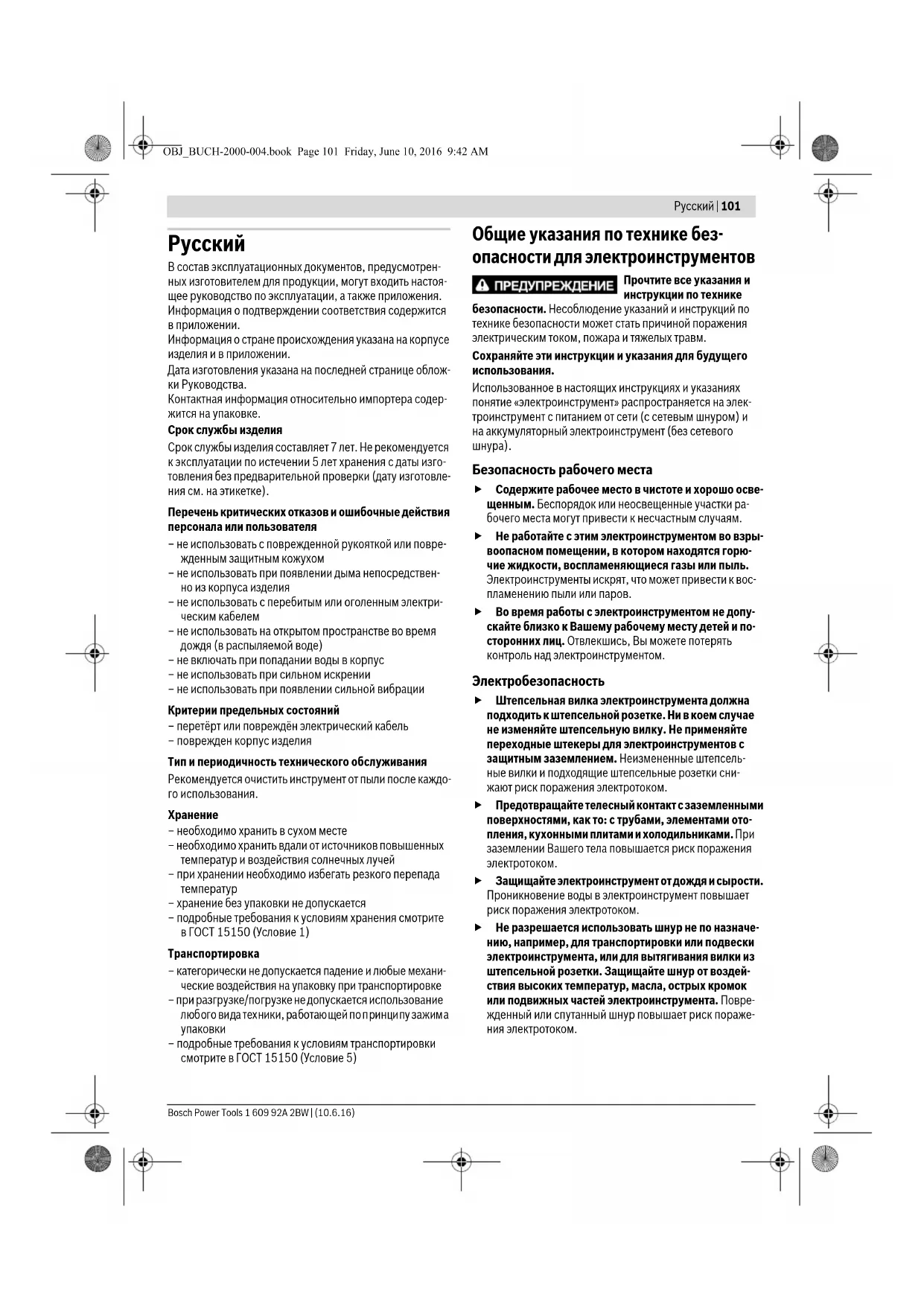 Безопасность рабочего места Содержите рабочее место в чистоте и хорошо осве- щенным. Беспорядок или неосвещенные участки ра- бочего места могут привести к несчастным случаям. Не работайте с этим электроинструментом во взры- воопасном помещении, в котором находятся горю- чие жидкости, воспламеняющиеся газы или пыль. Электроинструменты искрят, что может привести к вос- пламенению пыли или паров. Во время работы с электроинструментом не допу- скайте близко к Вашему рабочему месту детей и по- сторонних лиц. Отвлекшись, Вы можете потерять контроль над электроинструментом. Электробезопасность Штепсельная вилка электроинструмента должна подходить к штепсельной розетке. Ни в коем случае не изменяйте штепсельную вилку. Не применяйте переходные штекеры для электроинструментов с защитным заземлением. Неизмененные штепсель- ные вилки и подходящие штепсельные розетки сни- жают риск поражения электротоком. Предотвращайте телесный контакт с заземленными поверхностями, как то: с трубами, элементами ото- пления, кухонными плитами и холодильниками. При заземлении Вашего тела повышается риск поражения электротоком. Защищайте электроинструмент от дождя и сырости. Проникновение воды в электроинструмент повышает риск поражения электротоком. Не разрешается использовать шнур не по назначе- нию, например, для транспортировки или подвески электроинструмента, или для вытягивания вилки из штепсельной розетки. Защищайте шнур от воздей- ствия высоких температур, масла, острых кромок или подвижных частей электроинструмента. Повре- жденный или спутанный шнур повышает риск пораже- ния электротоком. OBJ_BUCH-2000-004.book Page 101 Friday, June 10, 2016 9:42 AM102 | Русский 1 609 92A 2BW | (25.1.16) Bosch Power Tools При работе с электроинструментом под открытым небом применяйте пригодные для этого кабели-уд- линители. Применение пригодного для работы под от- крытым небом кабеля-удлинителя снижает риск пора- жения электротоком. Если невозможно избежать применения электроин- струмента в сыром помещении, подключайте элек- троинструмент через устройство защитного отклю- чения. Применение устройства защитного отключения снижает риск электрического поражения. Безопасность людей Будьте внимательными, следите за тем, что Вы де- лаете, и продуманно начинайте работу с электро- инструментом. Не пользуйтесь электроинстру- ментом в усталом состоянии или если Вы нахо- дитесь в состоянии наркотического или алкогольно- го опьянения или под воздействием лекарств. Один момент невнимательности при работе с электроинстру- ментом может привести к серьезным травмам. Применяйте средства индивидуальной защиты и всегда защитные очки. Использование средств инди- видуальной защиты, как то: защитной маски, обуви на нескользящей подошве, защитного шлема или средств защиты органов слуха, – в зависимости от вида работы с электроинструментом снижает риск получения травм. Предотвращайте непреднамеренное включение электроинструмента. Перед подключением электроинструмента к электропитанию и/или к аккумулятору убедитесь в выключенном состоянии электроинструмента. Удержание пальца на выключа- теле при транспортировке электроинструмента и под- ключение к сети питания включенного электроинстру- мента чревато несчастными случаями. Убирайте установочный инструмент или гаечные ключи до включения электроинстру