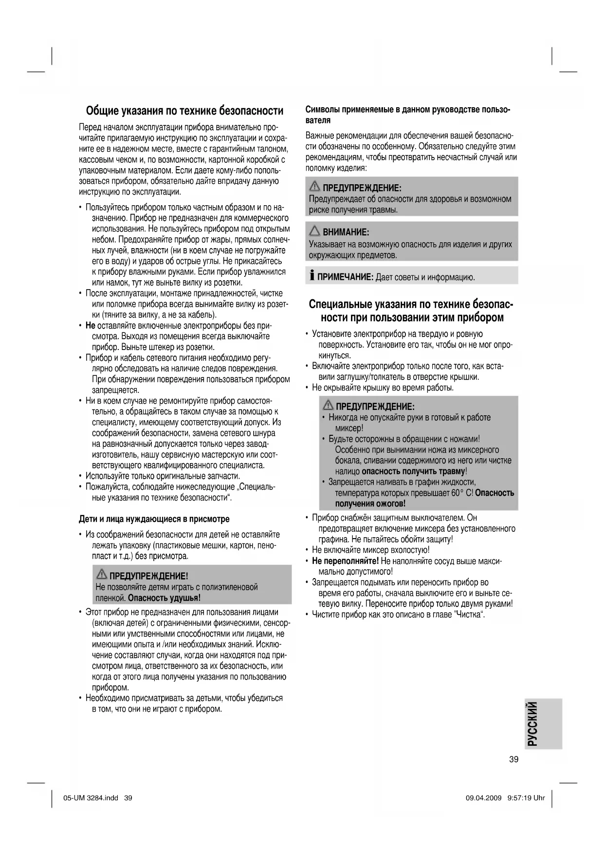 - Пожалуйста, соблюдайте нижеследующие „Специаль- ные указания по технике безопасности“. Дети и лица нуждающиеся в присмотре