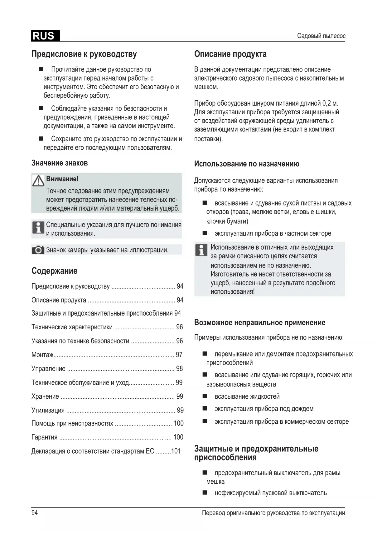 Использование по назначению Допускаются следующие варианты использования прибора по назначению: всасывание и сдувание сухой листвы и садовых отходов (трава, мелкие ветки, еловые шишки, клочки бумаги) эксплуатация прибора в частном секторе Использование в отличных или выходящих за рамки описанного целях считается использованием не по назначению. Изготовитель не несет ответственности за ущерб, нанесенный в результате подобного использования! Возможное неправильное применение Примеры использования прибора не по назначению: перемыкание или демонтаж предохранительных приспособлений всасывание или сдувание горящих, горючих или взрывоопасных веществ всасывание жидкостей эксплуатация прибора под дождем эксплуатация прибора в коммерческом секторе Защитные и предохранительные приспособления предохранительный выключатель для рамы