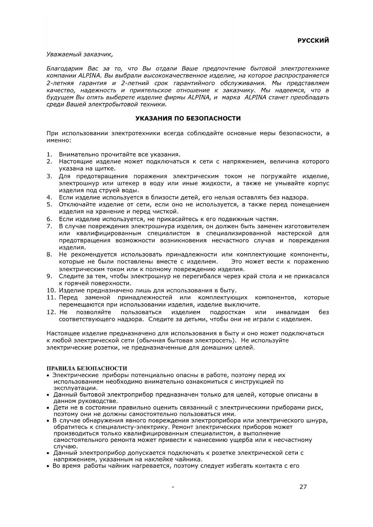 Уважаемый заказчик, Благодарим Вас за то, что Вы отдали Ваше предпочтение бытовой электротехнике компании ALPINA. Вы выбрали высококачественное изделие, на которое распространяется 2-летняя гарантия и 2-летний срок гарантийного обслуживания. Мы представляем качество, надежность и приятельское отношение к заказчику. Мы надеемся, что в будущем Вы опять выберете изделие фирмы ALPINA, и марка ALPINA станет преобладать среди Вашей электробытовой техники. УКАЗАНИЯ ПО БЕЗОПАСНОСТИ При использовании электротехники всегда соблюдайте основные меры безопасности, а