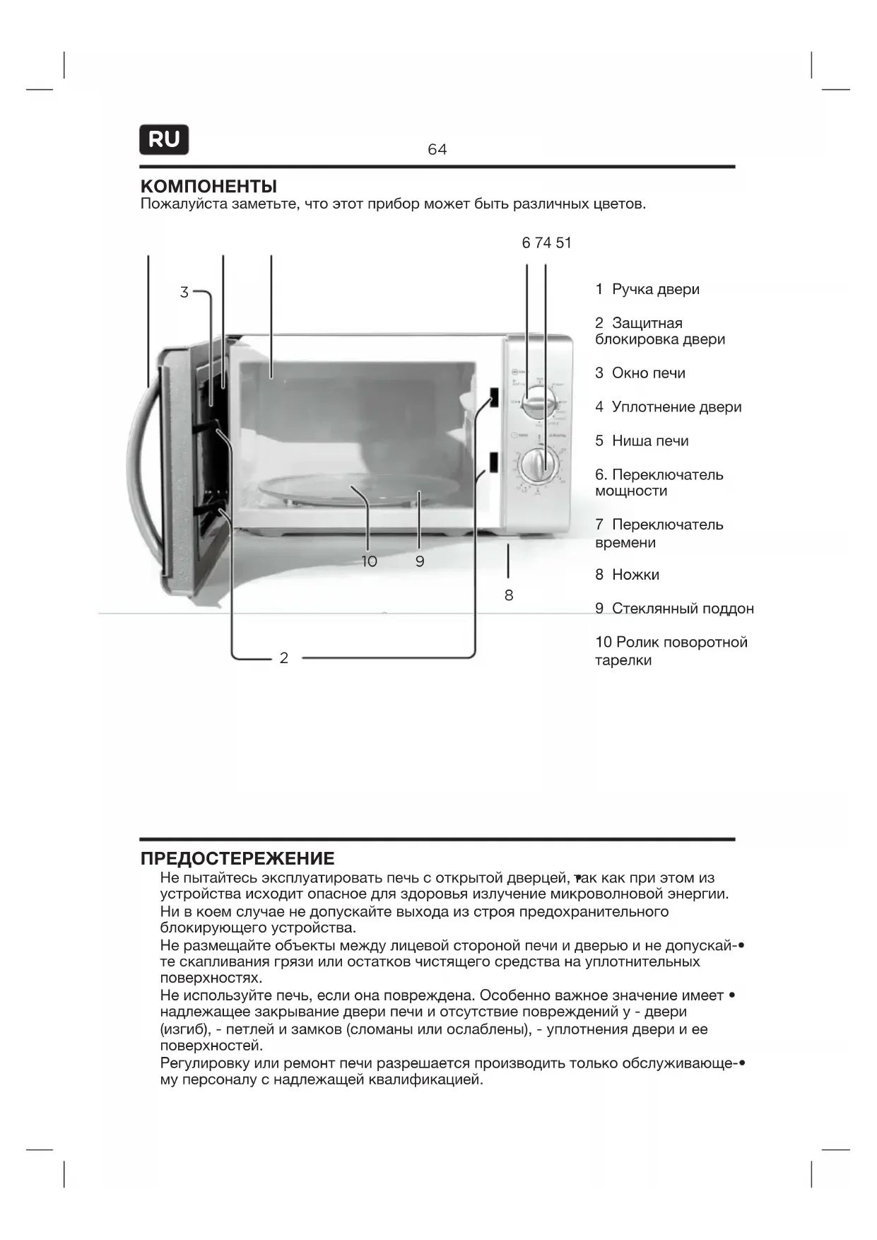 Поверните переключа- тель для выбора уровня готовки или разморозки. См. раздел ГОТОВКА МИКРОВОЛНАМИ. Устройство предназначено для размораживания, подогревания продуктов и приготовления блюд. Оно должно использоваться в полном соответствии с данными правилами. Ненадлежащее использование опасно, кроме того, оно влечет за собой утрату всех гарантийных прав. Основные правила безопасной эксплуатации помещены в отдельном документе. НадлеЖаЩее ИспользоваНИе Номинальное напряжение: 230~ в, 50 Гц / номинальная входная мощность (микро- волновый режим) - 1050 Вт / номинальная выходная мощность - 700 Вт / рабочая частота: 2450 МГц / наружные размеры: 258 мм (высота) х 440 мм (ширина) х 356 мм (глубина) / диаметр поворотной тарелки: 255 мм / емкость печи: 20 л / вес нетто: около 10 кг спеЦИФИкаЦИИ66