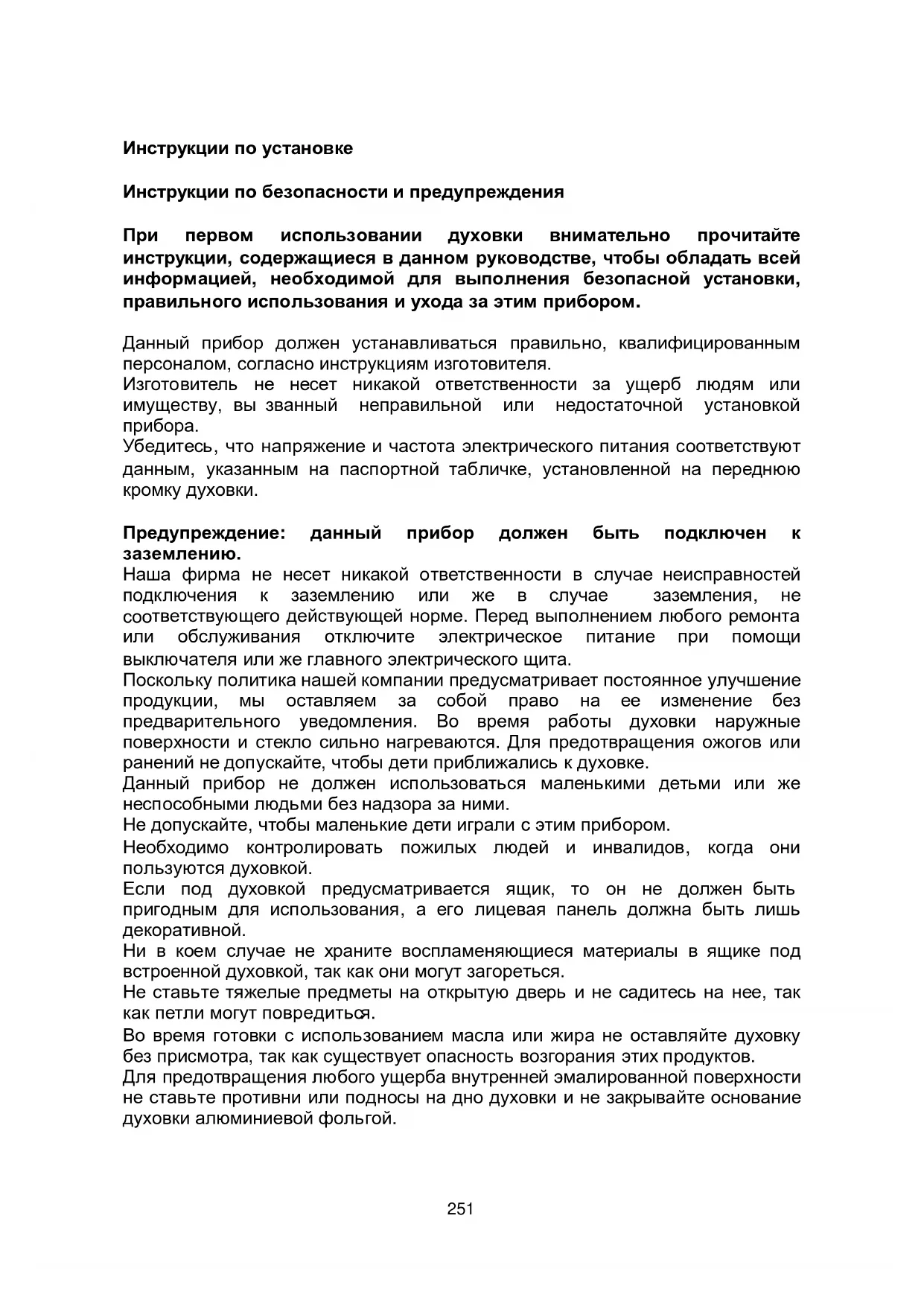 Merk: (*) Tallet for innsettingsrillen tilsvarer ovnsknappen. Ovnen skal forvarmes før bruk. Disse funksjonene bør brukes til ømfintlige og/eller forvarmede retter. Den samme retten kan tilberedes på forskjellige riller (tilberedningstiden er den samme). 250Инструкции по установке Инструкции по безопасности и предупреждения При первом использовании духовки внимательно прочитайте инструкции, содержащиеся в данном руководстве, чтобы обладать всей информацией, необходимой для выполнения безопасной установки, правильного использования и ухода за этим прибором. Данный прибор должен устанавливаться правильно, квалифицированным персоналом, согласно инструкциям изготовителя. Изготовитель не несет никакой ответственности за ущерб людям или имуществу, вы званный неправильной или недостаточной установкой