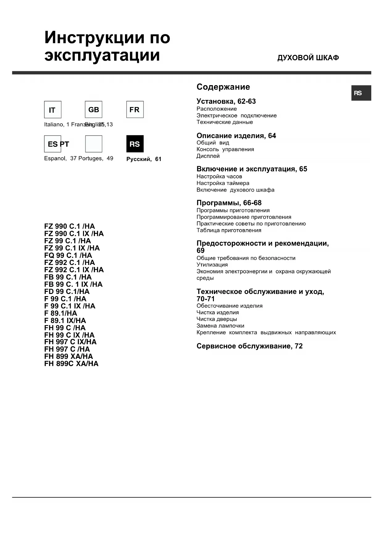 РУКОВОДСТВО ПОЛЬЗОВАТЕЛЯ FQ 99 C.1 (BK) HA HOTPOINT ARISTON