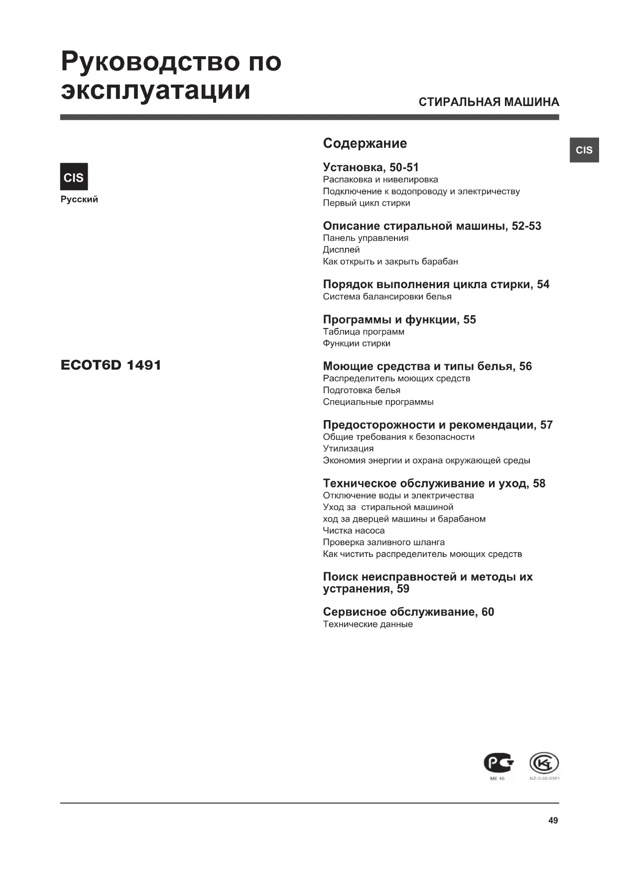 Экономия энергии и охрана окружающей среды Техническое обслуживание и уход, 58 Отключение воды и электричества Уход за стиральной машиной ход за дверцей машины и барабаном Чистка насоса Проверка заливного шланга Как чистить распределитель моющих средств Поиск неисправностей и методы их устранения, 59 Сервисное обслуживание, 60 Технические данные Руководство по эксплуатации СТИРАЛЬНАЯ МАШИНА50 CIS