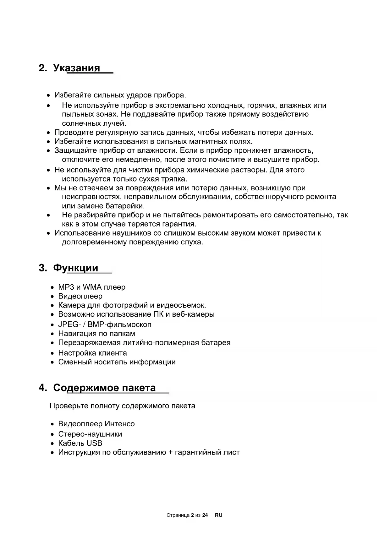 Проверьте полноту содержимого пакета Видеоплеер Интенсо Стерео-наушники Кабель USB Инструкция по обслуживанию + гарантийный листСтраница 3 из 24 RU