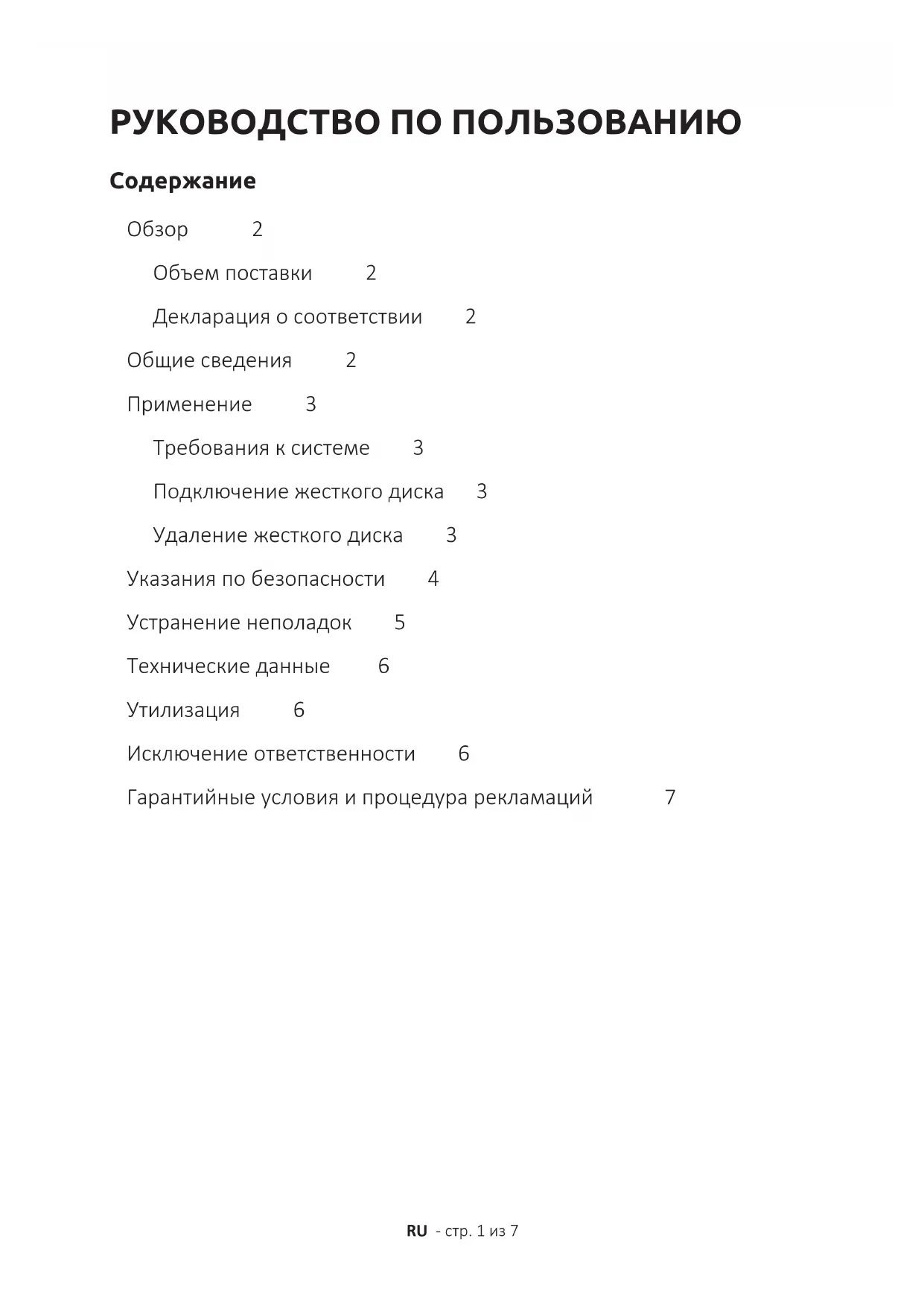 Oбзор 2 Объем поставки 2 Декларация о соответствии 2 Общие сведения 2 Применение 3 Требования к системе 3 Подключение жесткого диска 3 Удаление жесткого диска 3 Указания по безопасности 4 Устранение неполадок 5 Технические данные 6 Утилизация 6 Исключение ответственности 6 Гарантийные условия и процедура рекламаций 7RU - стр. 2 из 7 Внимательно прочтите и соблюдайте это руководство. Выполняйте все содержащиеся в этом руководстве указания, чтобы обеспечить долгую и надежную работу устройства. Храните это руководство в легко доступном месте. При передаче устройства другим пользователям передайте вместе с ним и руководство. Об этом руководстве ОБЩИЕ СВЕДЕНИЯ Декларация о соответствии Маркировка знаком „СЕ“ свидетельствует о том, что этот продукт отвечает требованиям всех действующих директив Европейского Союза, относящихся к этому продукту. Объем поставки
