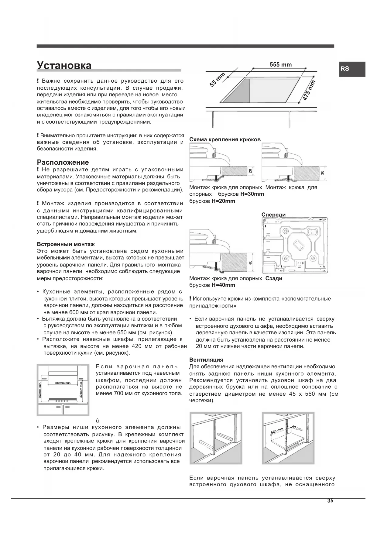 ! Важно сохранить данное руководство для его последующих консультации. В случае продажи, передачи изделия или при переезде на новое место жительства необходимо проверить, чтобы руководство оставалось вместе с изделием, для того чтобы его новыи владелец мог ознакомиться с правилами эксплуатации и с соответствующими предупреждениями.! Внимательно прочитаите инструкции: в них содержатся важные сведения об установке, эксплуатации и безопасности изделия. Расположение ! Не разрешаите детям играть с упаковочными материалами. Упаковочные материалы должны быть уничтожены в соответствии с правилами раздельного сбора мусора (см. Предосторожности и рекомендации).! Монтаж изделия производится в соответствии с данными инструкциями квалифицированными специалистами. Неправильныи монтаж изделия может стать причинои повреждения имущества и причинить ущерб людям и домашним животным.Встроенныи монтажЭто может быть установлена рядом кухонными мебельными элементами, высота которых не превышает уровень варочнои панели. Для правильного монтажа варочнои панели необходимо соблюдать следующие меры предосторожности:• Кухонные элементы, расположенные рядом с кухоннои плитои, высота которых превышает уровень варочнои панели, должны находиться на расстояние не менее 600 мм от края варочнои панели.• Вытяжка должна быть установлена в соответствии с руководством по эксплуатации вытяжки и в любом случае на высоте не менее 650 мм (см. рисунок).• Расположите навесные шкафы, прилегающие к вытяжке, на высоте не менее 420 мм от рабочеи поверхности кухни (см. рисунок).Если варочная панель устанавливается под навесным шкафом, последнии должен располагаться на высоте не менее 700 мм от кухонного топа.