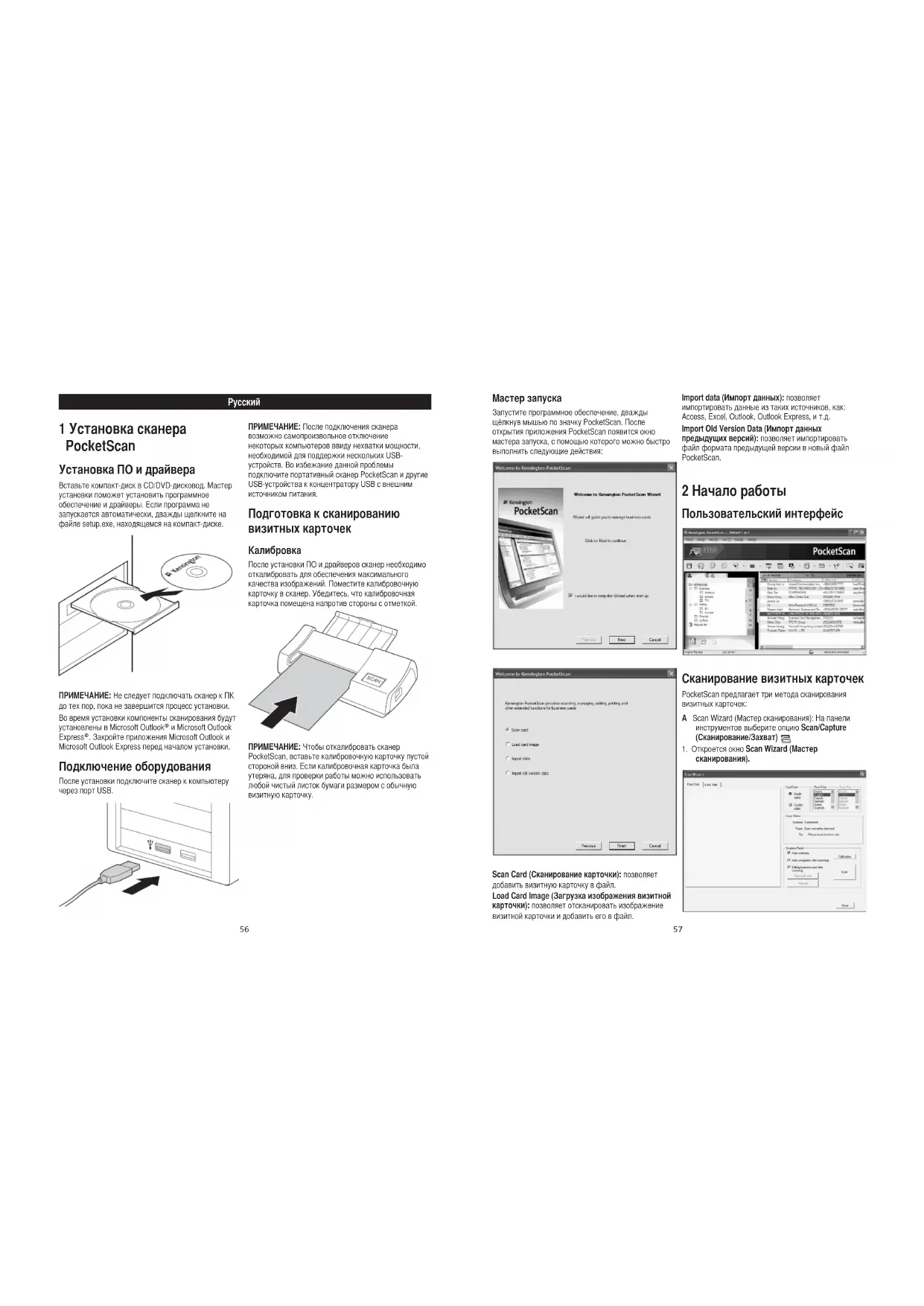 сканирования). 1 Установка сканера PocketScan Установка ПО и драйвера Вставьте компакт-диск в CD/DVD-дисковод. Мастер установки поможет установить программное обеспечение и драйверы. Если программа не запускается автоматически, дважды щелкните на файле setup.exe, находящемся на компакт-диске. ПРИМЕЧАНИЕ: Не следует подключать сканер к ПК до тех пор, пока не завершится процесс установки. Во время установки компоненты сканирования будут установлены в Microsoft Outlook® и Microsoft Outlook Express®. Закройте приложения Microsoft Outlook и Microsoft Outlook Express перед началом установки. Подключение оборудования После установки подключите сканер к компьютеру через порт USB. ПРИМЕЧАНИЕ: После подключения сканера возможно самопроизвольное отключение некоторых компьютеров ввиду нехватки мощности, необходимой для поддержки нескольких USB- устройств. Во избежание данной проблемы подключите портативный сканер PocketScan и другие USB-устройства к концентратору USB с внешним источником питания. Подготовка к сканированию визитных карточек