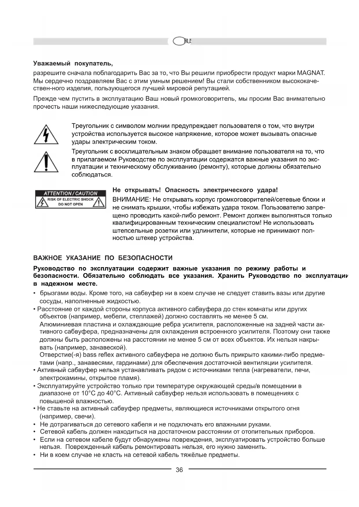 SУважаемый покупатель, разрешите сначала поблагодарить Вас за то, что Вы решили приобрести продукт марки MAGNAT. Мы сердечно поздравляем Вас с этим умным решением! Вы стали собственником высококаче- ствен-ного изделия, пользующегося лучшей мировой репутацией. Прежде чем пустить в эксплуатацию Ваш новый громкоговоритель, мы просим Вас внимательно прочесть наши нижеследующие указания. Треугольник с символом молнии предупреждает пользователя о том, что внутри устройства используется высокое напряжение, которое может вызывать опасные удары электрическим током. Треугольник с восклицательным знаком обращает внимание пользователя на то, что в прилагаемом Руководстве по эксплуатации содержатся важные указания по экс- плуатации и техническому обслуживанию (ремонту), которые должны обязательно соблюдаться. Не открывать! Опасность электрического удара! ВНИМАНИЕ: Не открывать корпус громкоговорителей/сетевые блоки и не снимать крышки, чтобы избежать удара током. Пользователю запре- щено проводить какой-либо ремонт. Ремонт должен выполняться только квалифицированным техническим специалистом! Не использовать штепсельные розетки или удлинители, которые не принимают пол- ностью штекер устройства. ВАЖНОЕ УКАЗАНИЕ ПО БЕЗОПАСНОСТИ Руководство по эксплуатации содержит важные указания по режиму работы и безопасности. Обязательно соблюдать все указания. Хранить Руководство по эксплуатации в надежном месте.