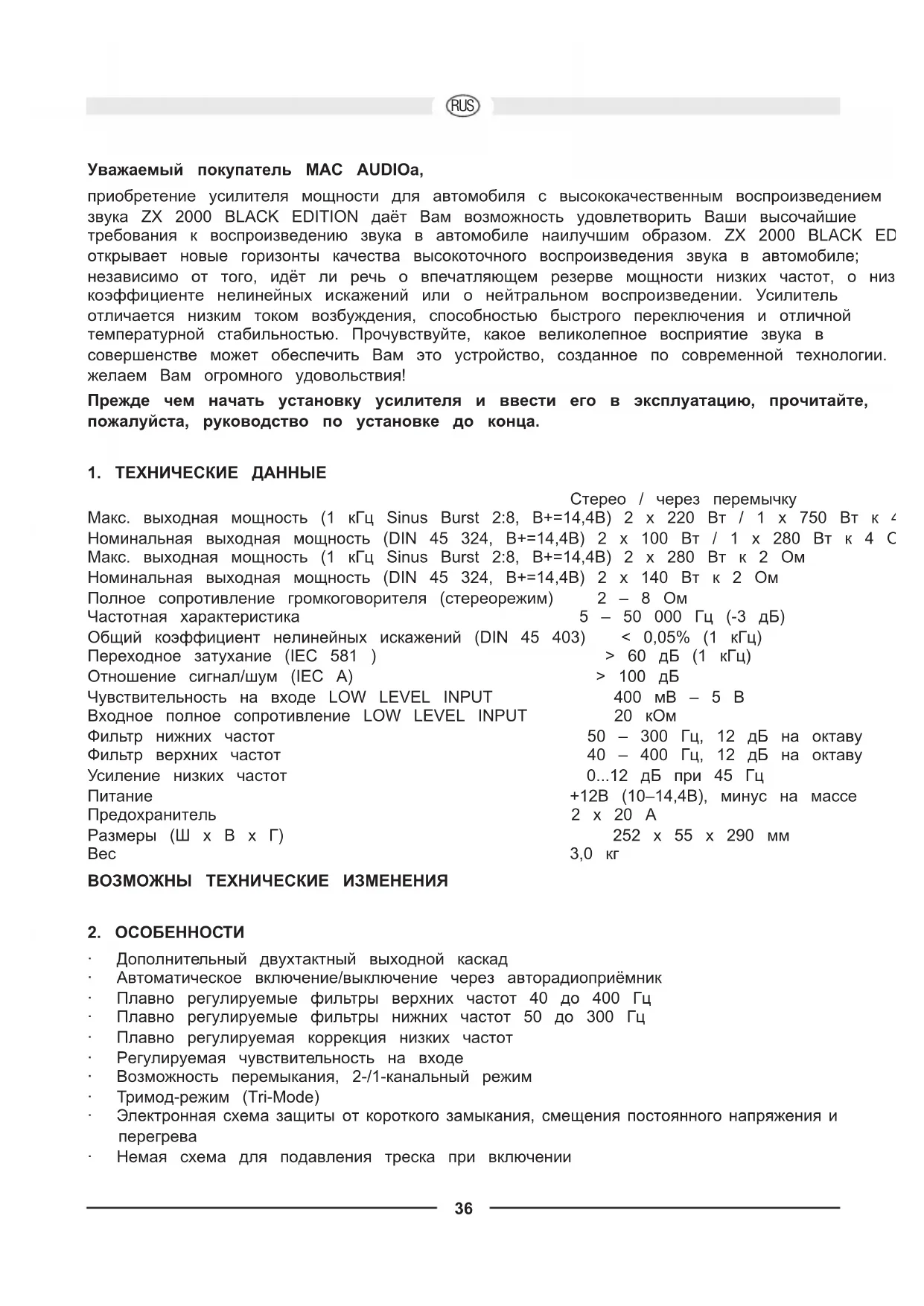 Om förstärkaren skall lämna högre effekt för att driva en subwoofer skall anslutningarna och inställningarna utföras enligt bild 3. Hur lågpassfiltret används beskrivs i kapitel 5.2. (1) Till bilradio, utgång vänster (2) Till bilradio, utgång höger (3) Subwoofer BILD 4 MONO-DRIFT MED BILRADIO MED SUBWOOFERUTGÅNG (1) Till bilradio, utgång subwoofer (2) Subwoofer BILD 5 MANÖVRERINGSENHETER OCH IN-/UTGÅNGER (1) Väljaromkopplare HPF (högpassfilter) / LPF (lågpassfilter) / FULL (2) Regulator för växelfrekvens för högpass (3) Regulator för växelfrekvens för lågpass (4) Bas-Boost-reglering (5) Regulator för ingångsnivå (6) Mono/stereo-omkopplare (7) Lågnivåingång (8) Utgångar för anslutning av ytterligare förstärkare36 RUS Уважаемый покупатель MAC AUDIOа, приобретение усилителя мощности для автомобиля с высококачественным воспроизведением звука ZX 2000 BLACK EDITION даёт Вам возможность удовлетворить Ваши высочайшие требования к воспроизведению звука в автомобиле наилучшим образом. ZX 2000 BLACK EDITION открывает новые горизонты качества высокоточного воспроизведения звука в автомобиле; независимо от того, идёт ли речь о впечатляющем резерве мощности низких частот, о низком коэффициенте нелинейных искажений или о нейтральном воспроизведении. Усилитель отличается низким током возбуждения, способностью быстрого переключения и отличной температурной стабильностью. Прочувствуйте, какое великолепное восприятие звука в совершенстве может обеспечить Вам это устройство, созданное по современной технологии. Мы желаем Вам огромного удовольствия! Прежде чем начать установку усилителя и ввести его в эксплуатацию, прочитайте, пожалуйста, руководство по установке до конца.